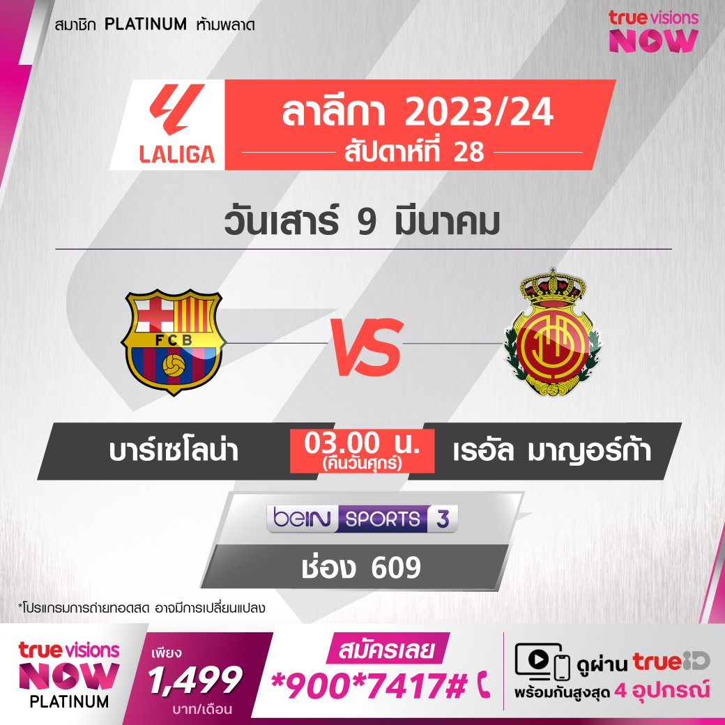 Barcelona vs Mallorca เวลา 03.00-05.00 ทางช่อง beIN 3 (609)