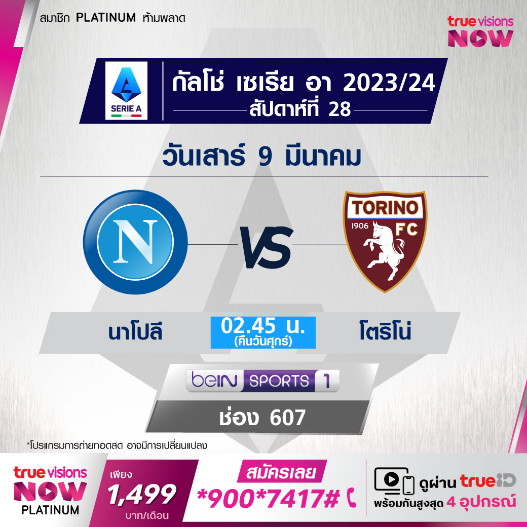 Napoli vs Torino เวลา 02.45-04.45 ทางช่อง beIN 1 (607)