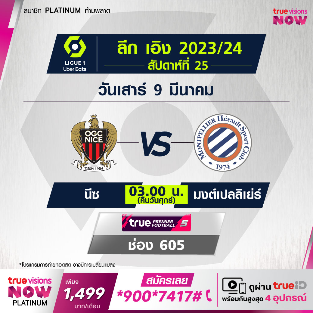 Nice vs Montpellier เวลา 03.00-05.00 ทางช่อง TPF 5 (605)