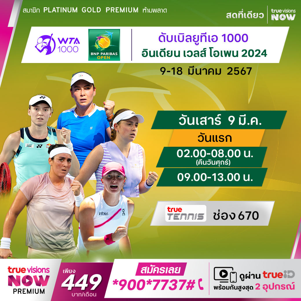 เทนนิสหญิง ดับเบิ้ลยูทีเอ ทัวร์ รายการใหญ่ที่ได้รับการยกย่องระดับ "แกรนด์สแลมที่ 5 ของปี" ในรายการ อินเดียน เวลส์ โอเพ่น นำโดยมือหนึ่งของโลกในเวลานี้อย่าง อิกา ซิออนเทค, อารีนา ซาบาเลนก้า นักเทนนิสที่ผลงานร้อนแรงที่สุด, โคโค กอฟ์ฟ ขวัญใจเจ้าถิ่น และ เอเลนา ริบาคินา แชมป์เก่ารายการนี้ ร่วมลุ้นกันว่าใครจะคว้าแชมป์ไปครอง ชมสดที่ ทรูวิชั่นส์
