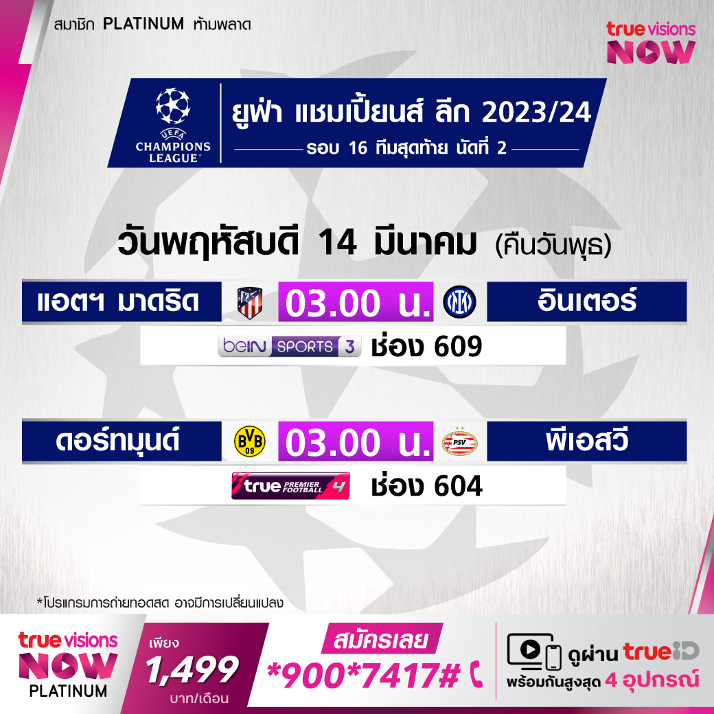 Atletico vs Inter เวลา 03.00-05.00 ทางช่อง beIN 3 (609)