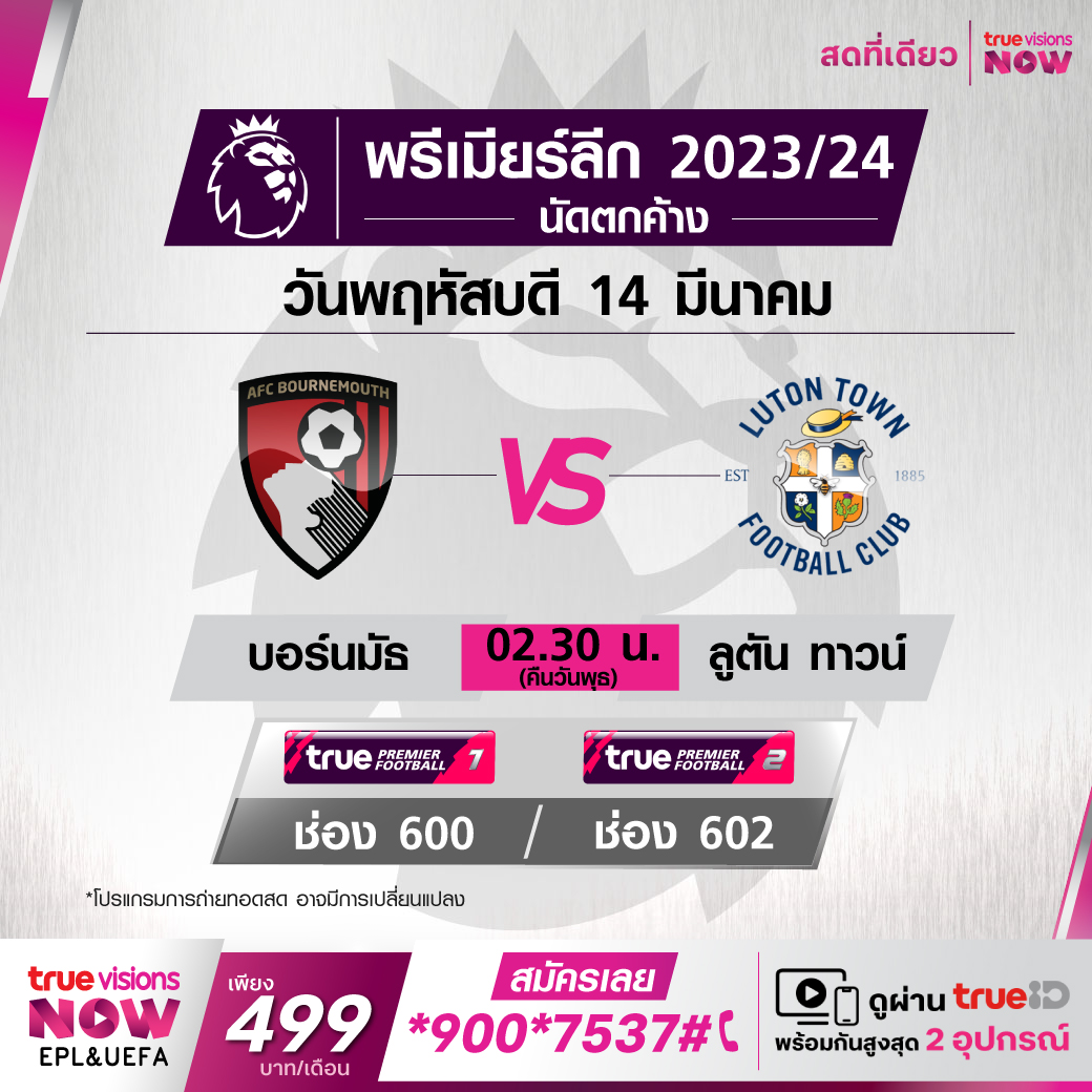 Bournemouth vs Luton Town เวลา 02:30 - 04:30 ทางช่อง TPF 1(600) / TPF 2 (602)