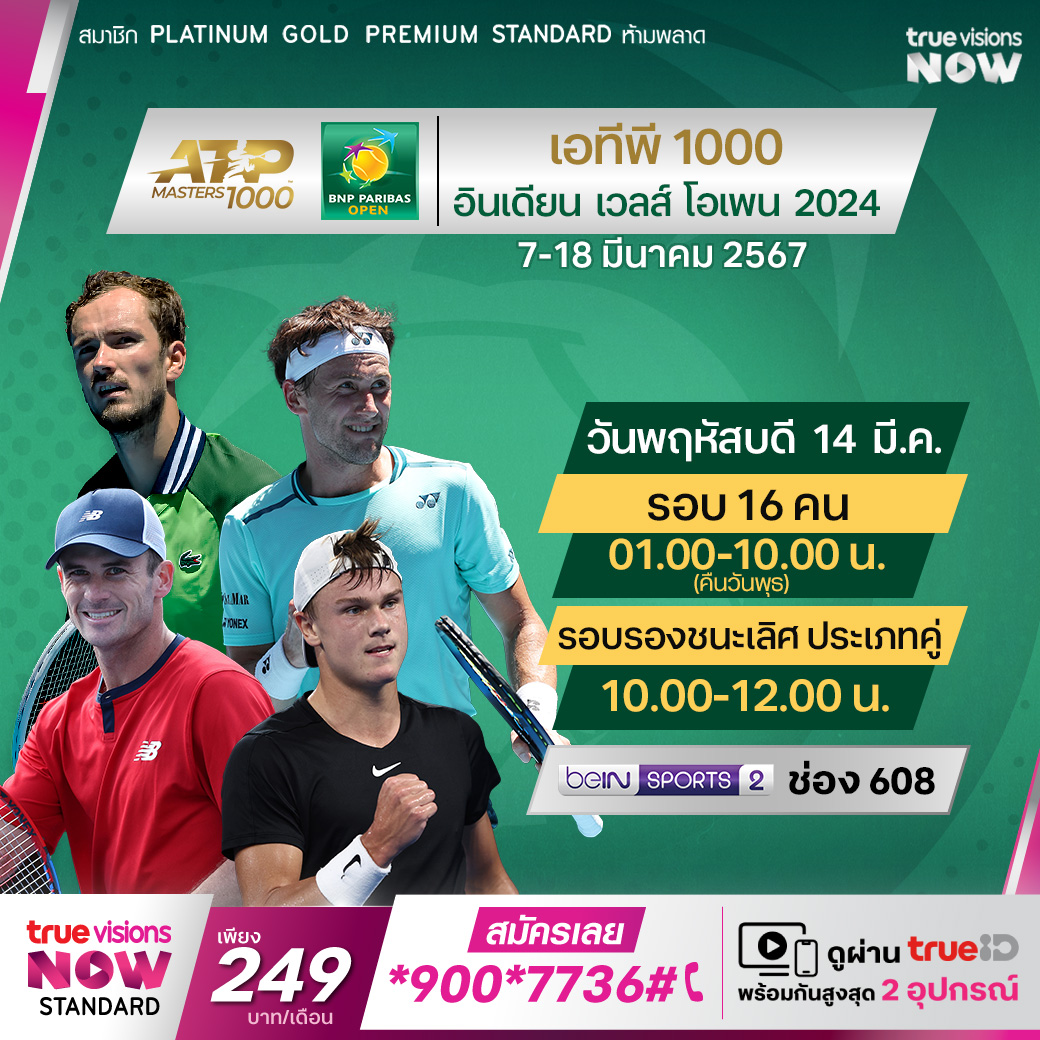 เทนนิส เอทีพี ทัวร์ รายการใหญ่ ที่ได้รับการยกย่องระดับ "แกรนด์สแลมที่ 5 ของปี" ในศึก อินเดียน เวลส์ โอเพ่น นำมาโดยสตาร์ดังอย่าง โนวัค ยอโควิช, ราฟาเอล นาดาล และแชมป์เก่าอย่าง คาร์ลอส อัลคาราซ จากสเปน และ ยานนิค ซินเนอร์ นักเทนนิสที่มาแรงที่สุดในยุคนี้ ร่วมลุ้นว่า ใครจะคว้าแชมป์ไปครอง ดูสดที่ ทรูวิชั่นส์