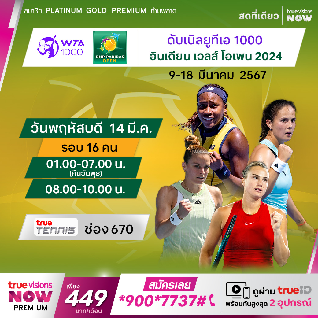 เทนนิสหญิง ดับเบิ้ลยูทีเอ ทัวร์ รายการใหญ่ที่ได้รับการยกย่องระดับ "แกรนด์สแลมที่ 5 ของปี" ในรายการ อินเดียน เวลส์ โอเพ่น นำโดยมือหนึ่งของโลกในเวลานี้อย่าง อิกา ซิออนเทค, อารีนา ซาบาเลนก้า นักเทนนิสที่ผลงานร้อนแรงที่สุด, โคโค กอฟ์ฟ ขวัญใจเจ้าถิ่น และ เอเลนา ริบาคินา แชมป์เก่ารายการนี้ ร่วมลุ้นกันว่าใครจะคว้าแชมป์ไปครอง ชมสดที่ ทรูวิชั่นส์