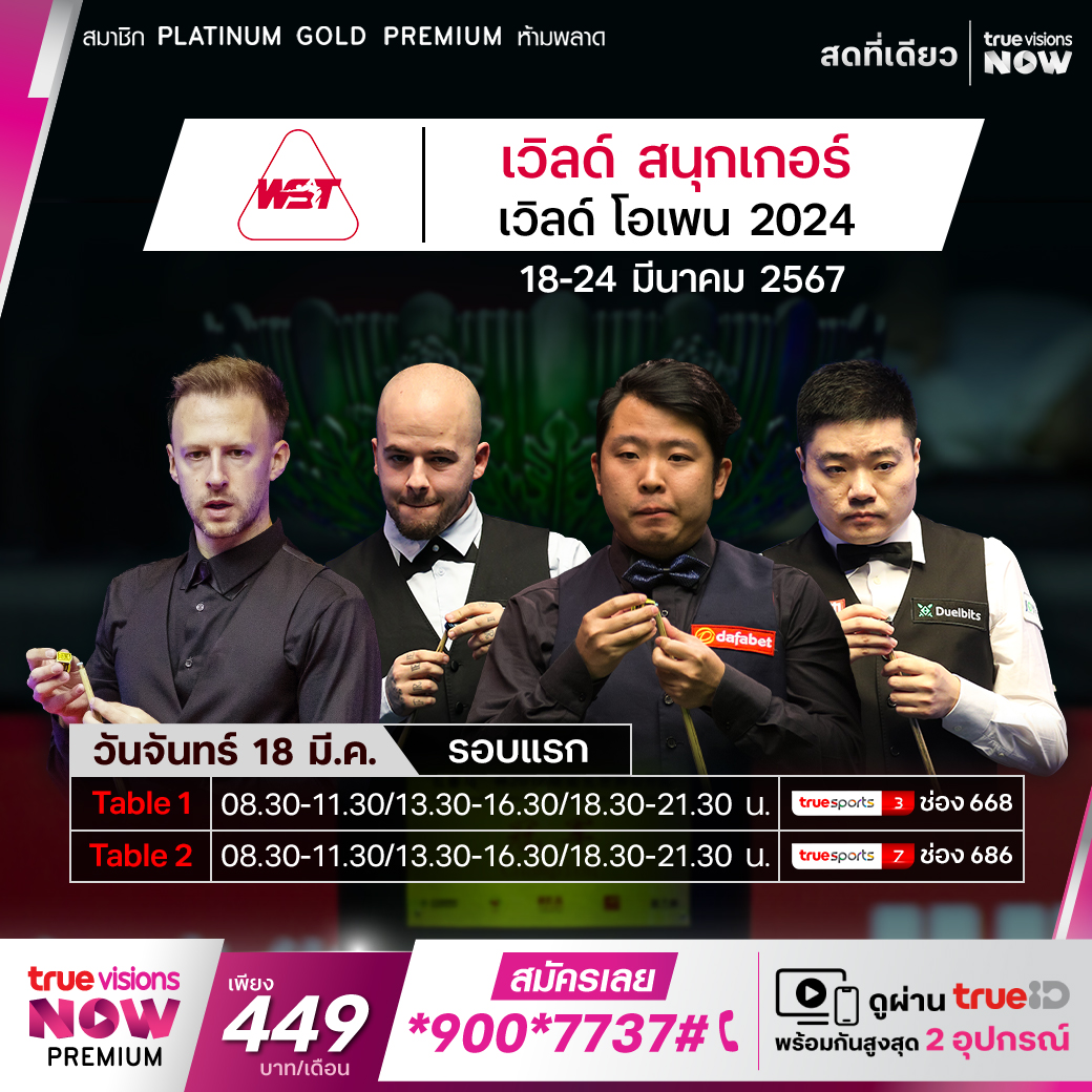 ศึกสนุกเกอร์ รายการ เวิลด์ โอเพ่น 2024 ที่ยู่ฉาน มณฑลเจียนซี่ ประเทศจีน นักสนุกเกอร์ระดับโลกรวมตัวเพื่อชิงเงินรางวัลมหาศาล เป็นรายการที่ 3 ในฤดูกาลนี้ ชมสดเอ็กซ์คลูซีฟ ตั้งแต่รอบแรกถึงรอบชิงชนะเลิศ ร่วมลุ้นกันว่าใครจะก้าวขึ้นไปเป็นแชมป์ปีนี้ ที่เดียวที่ ทรูวิชั่นส์