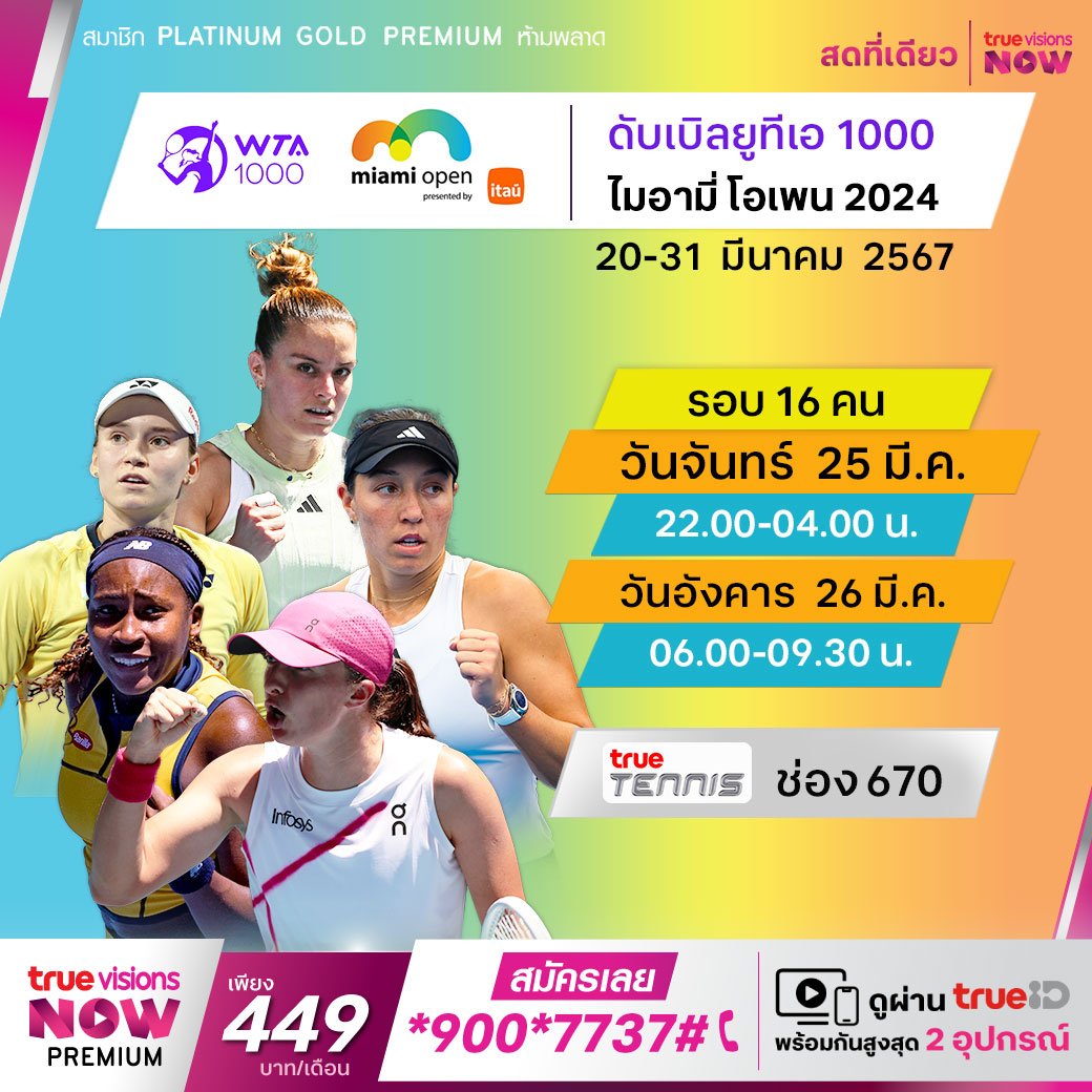 วันนี้มีอะไรดูที่ ทรูวิชั่นส์ ประจำวันจันทร์ที่ 25 มีนาคม 67 ยังคงมีกีฬาที่น่าสนใจให้ได้ตามลุ้นตามเชียร์กันเหมือนเดิม คอเทนนิสพลาดไม่ได้กับ เทนนิส เอทีพี ทัวร์ และ ดับเบิ้ลยูทีเอ ทัวร์ รายการ ไมอามี่ โอเพ่น ที่เข้มข้นมากขึ้นเรื่อยๆ งานนี้ ทรูวิชั่นส์ จัดเต็มให้ชมกันถึงบ้าน