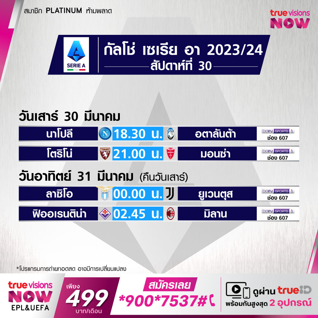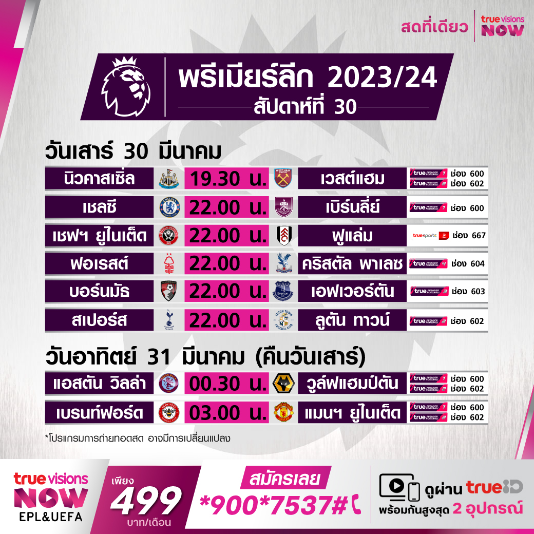 วันนี้มีอะไรดูที่ ทรูวิชั่นส์ ประจำวันเสาร์ที่ 30 มีนาคม 67 ยังคงมีกีฬาที่น่าสนใจให้ได้ตามลุ้นตามเชียร์กันเหมือนเดิม โดยในส่วนของฟุตบอลนั้นยังมีศึกพรีเมียร์ลีก อังกฤษ, กัลโช่ เซเรีย อา อิตาลี, ลา ลีกา สเปน, ลีก เอิง ฝรั่งเศส และ ซาอุดิ โปร ลีก ให้ได้ตามเชียร์กันต่อเนื่อง ส่วนกีฬาอื่นๆ ยังมีเทนนิส เอทีพี ทัวร์ และ ดับเบิ้ลยูทีเอ ทัวร์ รายการ ไมอามี่ โอเพ่น, กอล์ฟ พีจีเอ ทัวร์ รายการ เท็กซัส ชิลเดรนส์ ฮูสตัน โอเพ่น, ดีพี เวิลด์ ทัวร์ รายการ ฮีโร่ อินเดียน โอเพ่น, แอลพีจีเอ ทัวร์ รายการ ฟอร์ด แชมเปี้ยนชิพ, แบดมินตัน บีดับเบิ้ลยูเอฟ รายการ มาดริด สเปน มาสเตอร์ส, ศึกยูเอฟซี ไฟต์ ไนท์, ศึกเวิลด์ สนุกเกอร์ รายการ เวิลด์ มิกซ์ ดับเบิ้ลส์ 2024, วอลเลย์บอลลีกหญิง โคโว วี-ลีก และ บาสเกตบอลเอ็นบีเอ งานนี้ ทรูวิชั่นส์ จัดเต็มให้ชมกันถึงบ้าน