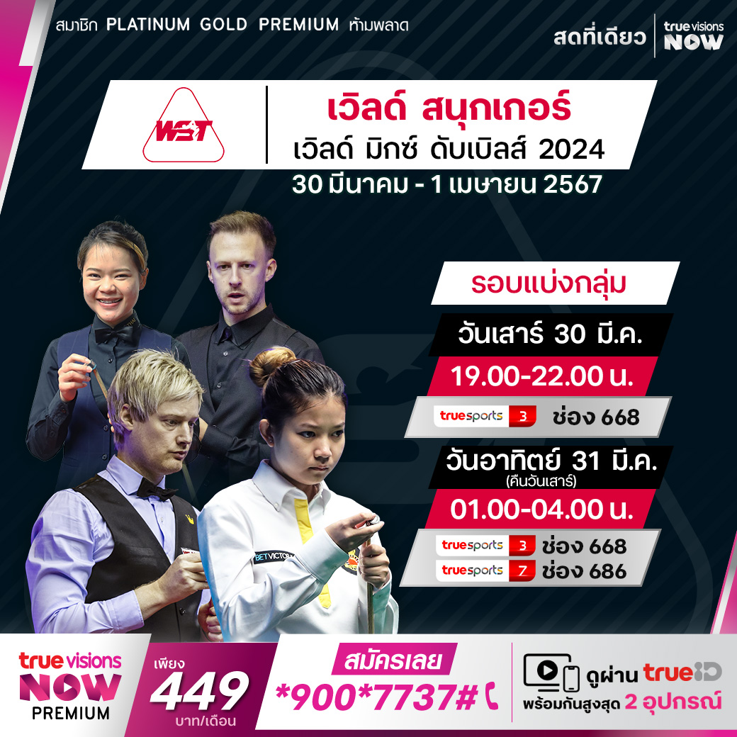 เวิลด์ สนุกเกอร์ รายการ เวิลด์ มิกซ์ ดับเบิ้ลส์ 2024 หรือทีมผสมชิงแชมป์โลก ที่แมนเชสเตอร์ เซนทรัล ในเมืองแมนเชสเตอร์ ประเทศอังกฤษ แชมป์เก่า มิ้งค์ สระบุรี หรือ ณัชชารัตน์ วงศ์หฤทัย และ นีล โรเบิร์ตสัน ป้องกันตำแหน่งกับคู่ระดับโลกอย่าง จั๊ดด์ ทรัมป์, ลูก้า เบรเซล แชมป์โลกคนล่าสุด และ มาร์ค อัลเลน ใครจะเป็นแชมป์ปีนี้ ชมสด เอ็กซ์คลูซีฟ ครบทุกแมตช์ ที่เดียวที่ ทรูวิชั่นส์