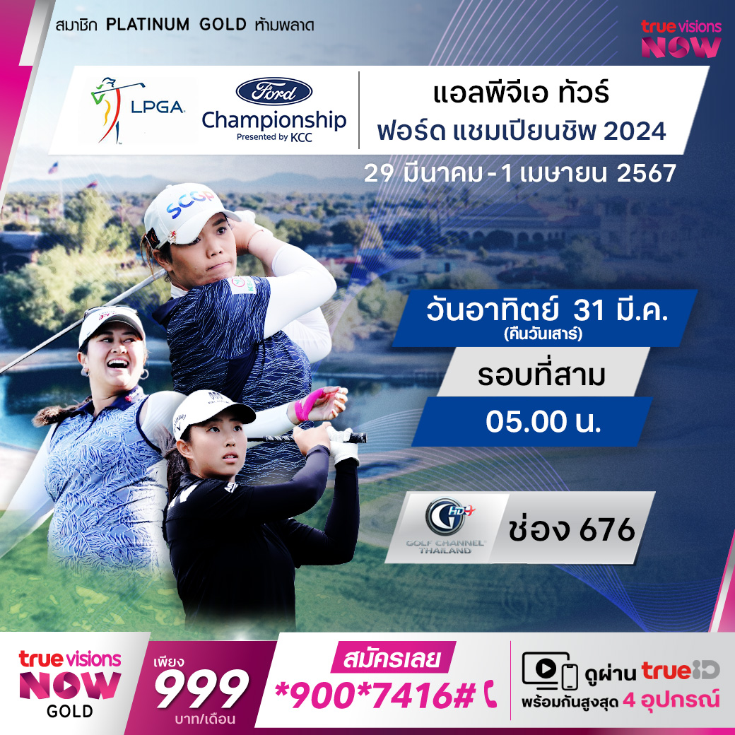 กอล์ฟหญิง แอลพีจีเอ ทัวร์ รายการ ฟอร์ด แชมเปี้ยนชิพ พรีเซนต์เต็ด บาย เคซีซี ที่สนาม เซวิลล์ กอล์ฟ แอนด์ คันทรี่ คลับ เมืองกิลเบิร์ต รัฐอริโซน่า ร่วมเชียร์โปรสาวไทยลุ้นแชมป์กับนักกอล์ฟชั้นนำของโลก พร้อมกับชิงเงินรางวัลรวม 2,250,000 เหรียญสหรัฐฯ หรือ ประมาณ 79.8 ล้านบาท ชมสด รอบแรก ถึงรอบสุดท้าย ทางทรูวิชั่นส์