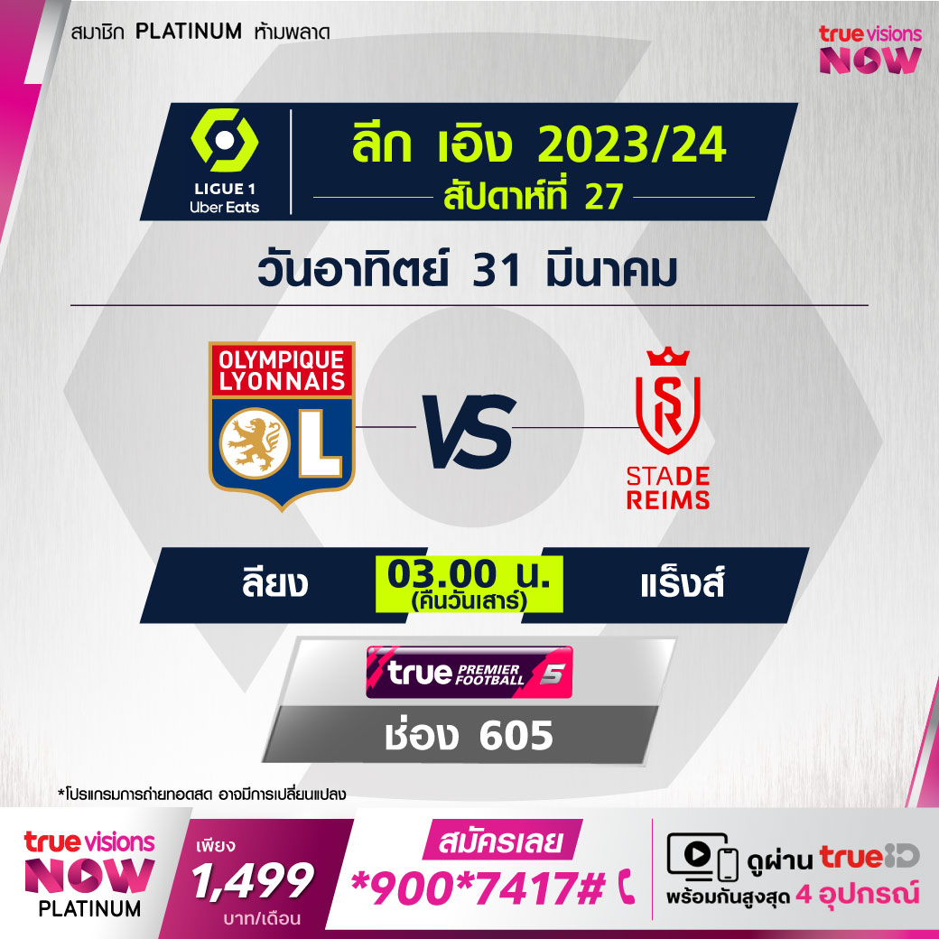 Lyon vs Reims เวลา 03.00-05.00 ทางช่อง TPF 5 (605)