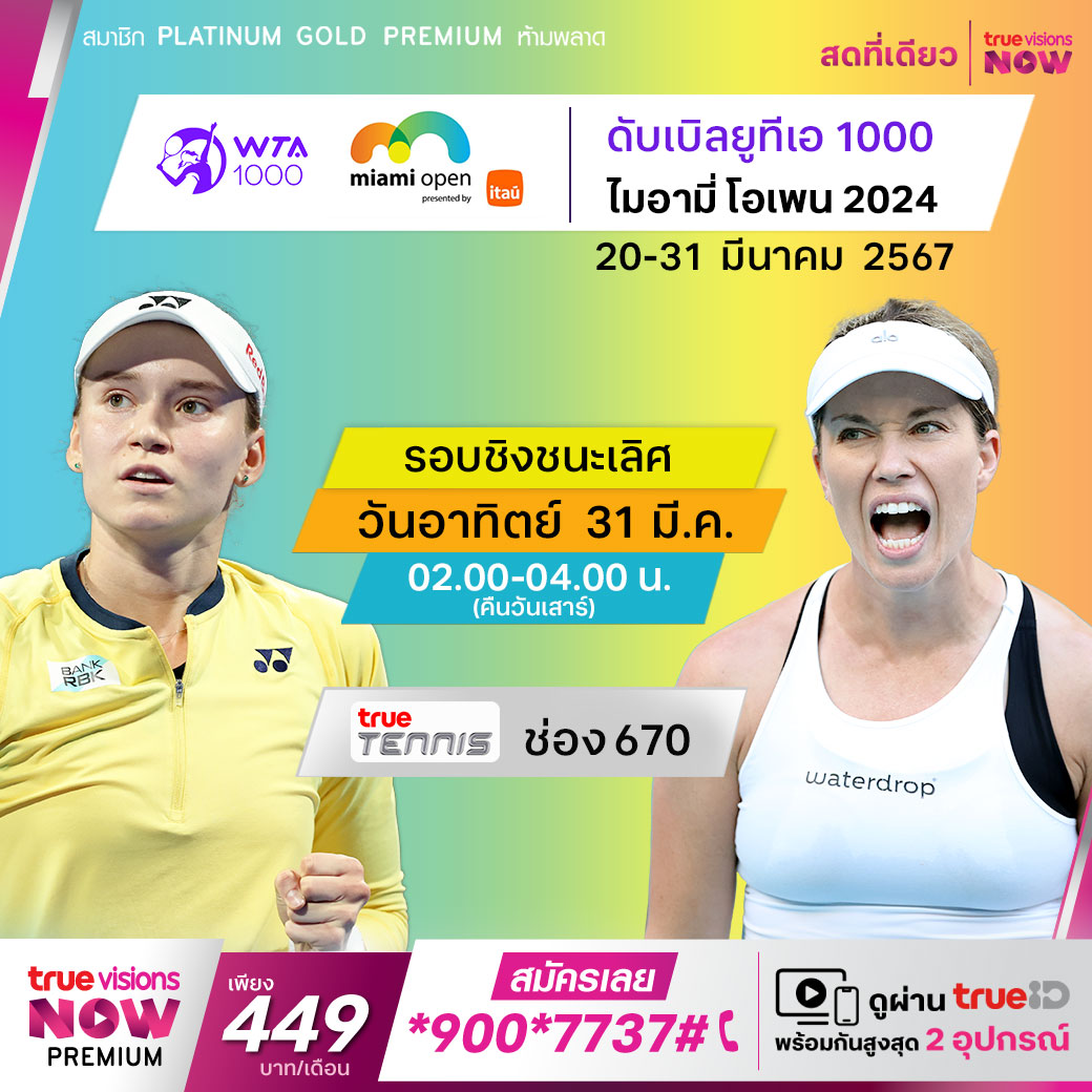 การแข่งขันเทนนิสหญิง ดับเบิ้ลยูทีเอ ทัวร์ รายการ ไมอามี่ โอเพ่น การแข่งขันรายการสุดท้ายบนทวีปอเมริกาเหนือในช่วงต้นปี ที่เมืองไมอามี่ รัฐฟลอริด้า มาถึงในรอบชิงชนะเลิศแล้ว ใครจะคว้าแชมป์ไปครอง ติดตาดได้ที่ ทรูวิชั่นส์ ที่เดียว