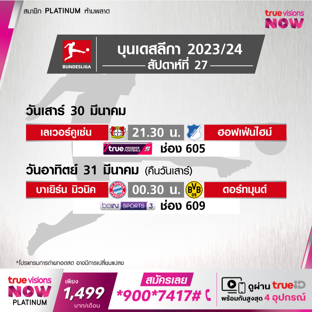 Leverkusen vs Hoffenheim เวลา 21.30-23.30 ทางช่อง TPF 5 (605)