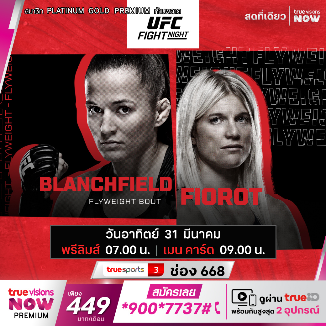 ยูเอฟซี ไฟต์ ไนท์ สัปดาห์นี้ คู่เอกเป็นการเจอกันของสองนักสู้จอมแกร่งฝ่ายหญิงรุ่นฟลายเวต เอริน แบล้นช์ฟิลด์ รองแชมป์อันดับ 2 ชาวอเมริกัน ปะทะกับ เมนอน ฟิออโรต์ รองแชมป์อันดับ 3 จากฝรั่งเศส ชมสด ครบตั้งแต่ช่วงพรีลิมส์ และมันต่อเนื่องกับ เมนคาร์ด เอ็กซ์คลูซีฟ ที่เดียว ที่ทรูวิชั่นส์