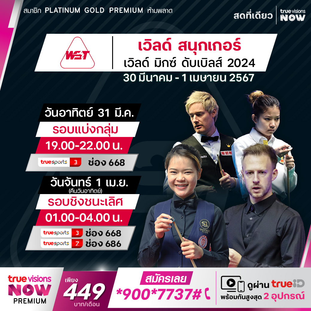 เวิลด์ สนุกเกอร์ รายการ เวิลด์ มิกซ์ ดับเบิ้ลส์ 2024 หรือทีมผสมชิงแชมป์โลก ที่แมนเชสเตอร์ เซนทรัล ในเมืองแมนเชสเตอร์ ประเทศอังกฤษ แชมป์เก่า มิ้งค์ สระบุรี หรือ ณัชชารัตน์ วงศ์หฤทัย และ นีล โรเบิร์ตสัน ป้องกันตำแหน่งกับคู่ระดับโลกอย่าง จั๊ดด์ ทรัมป์, ลูก้า เบรเซล แชมป์โลกคนล่าสุด และ มาร์ค อัลเลน ใครจะเป็นแชมป์ปีนี้ ชมสด เอ็กซ์คลูซีฟ ครบทุกแมตช์ ที่เดียวที่ ทรูวิชั่นส์