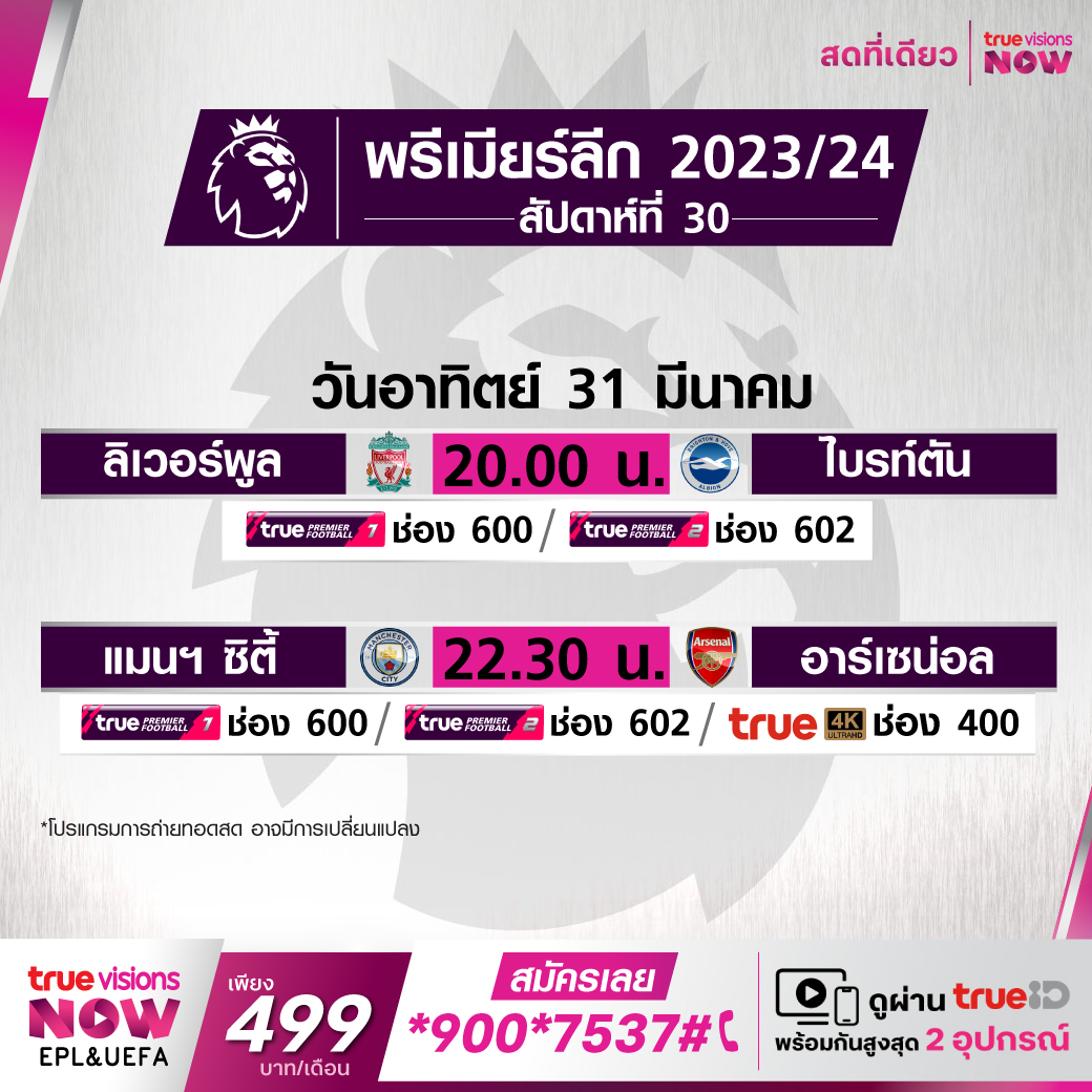 Man City vs Arsenal เวลา 22:30 - 00:30 ทางช่อง TPF 1(600) / TPF 2 (602) / 4K (400)