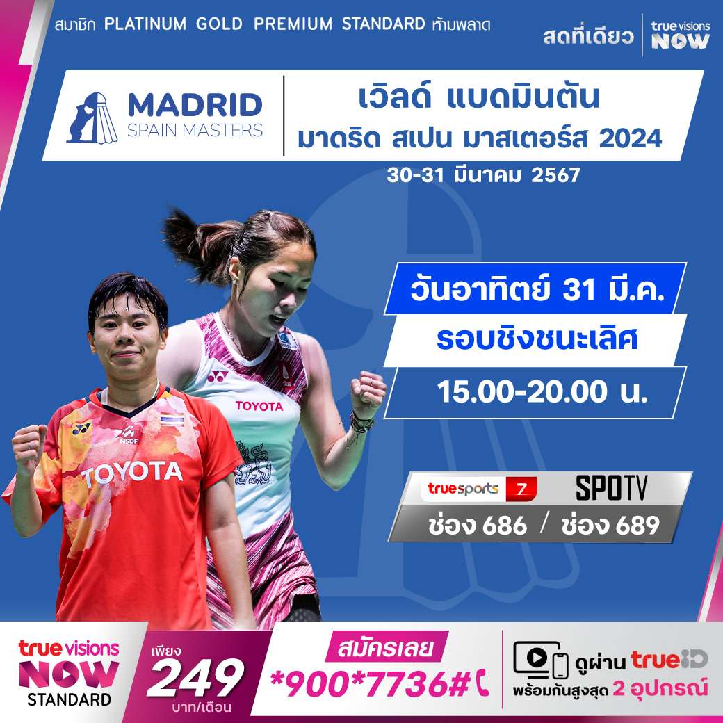 แบดมินตัน บีดับเบิ้ลยูเอฟ เวิลด์ ทัวร์ ซูเปอร์ 300 รายการ มาดริด สเปน มาสเตอร์ส ที่กรุงมาดริด ประเทศสเปน ร่วมเชียร์ทีมนักตบลูกขนไก่ไทย ลุยคว้าชัยชนะเพื่อลุ้นเป็นแชมป์ กับมือระดับโลกที่มาร่วมแข่งขันกันคับคั่ง ชมสด เอ็กซ์คลูซีฟ ที่เดียว ที่ทรูวิชั่นส์