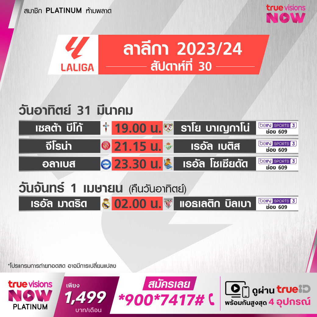 Real Madrid vs Athletic เวลา 02.00-04.00 ทางช่อง beIN 3 (609)