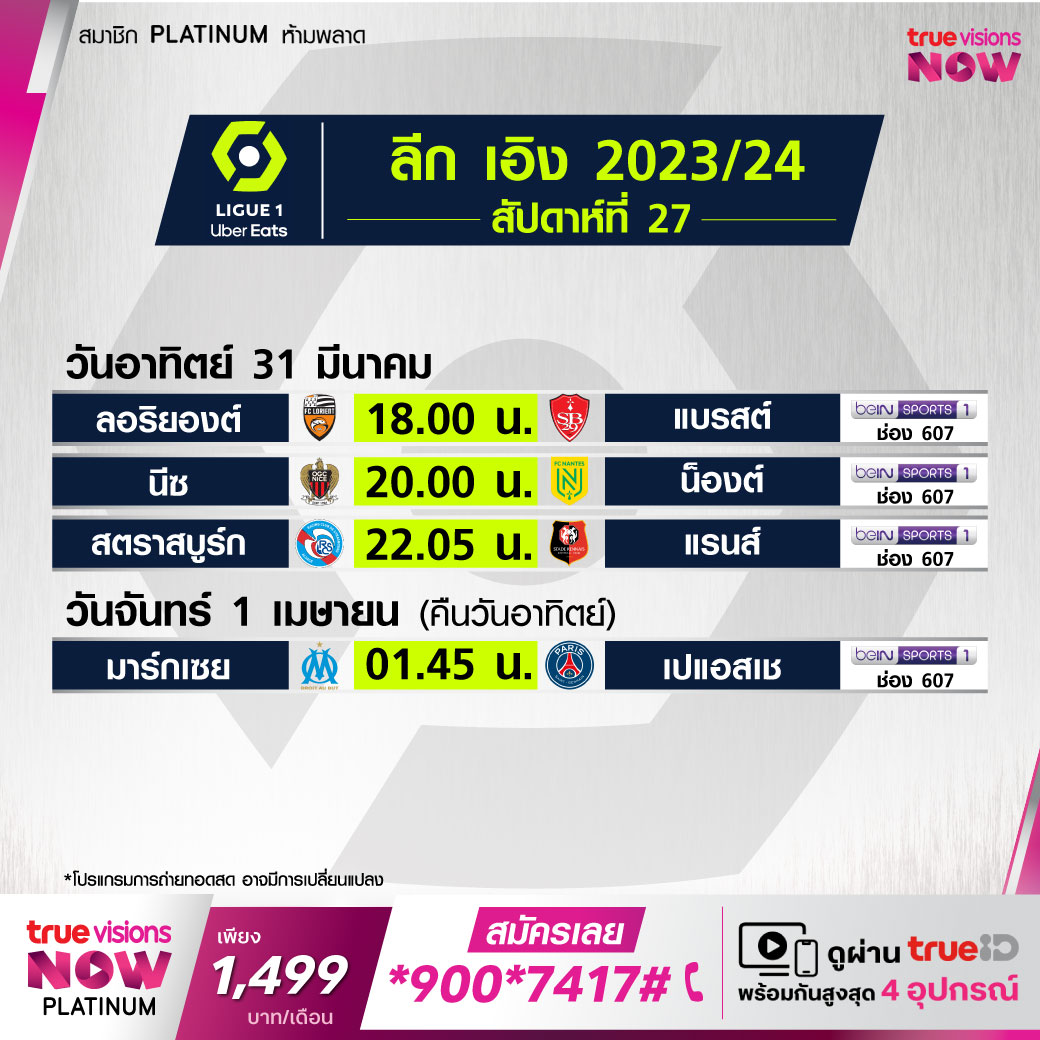 Marseille vs PSG เวลา 01.45-03.45 ทางช่อง beIN 1 (607)