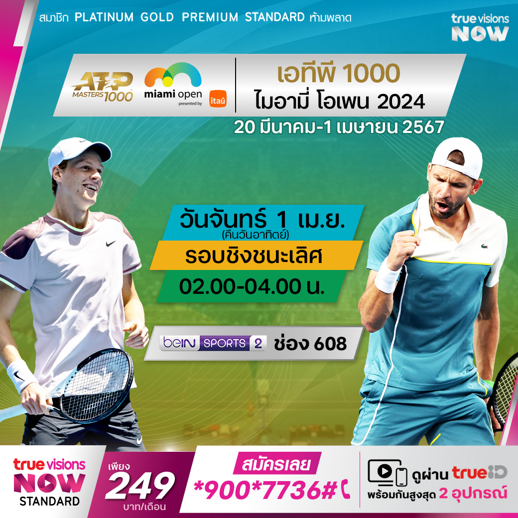 เทนนิสชาย เอทีพี ทัวร์ รายการ ไมอามี่ โอเพ่น เทนนิสรายการใหญ่ส่งท้ายบนทวีปอเมริกาเหนือในช่วงต้นปี เดินทางมาถึงในรอบชิงชนะเลิศแล้ว ร่วมลุ้นว่าใครจะคว้าแชมป์ไปครอง ติดตามชมการถ่ายทอดสดได้ที่ ทรูวิชั่นส์