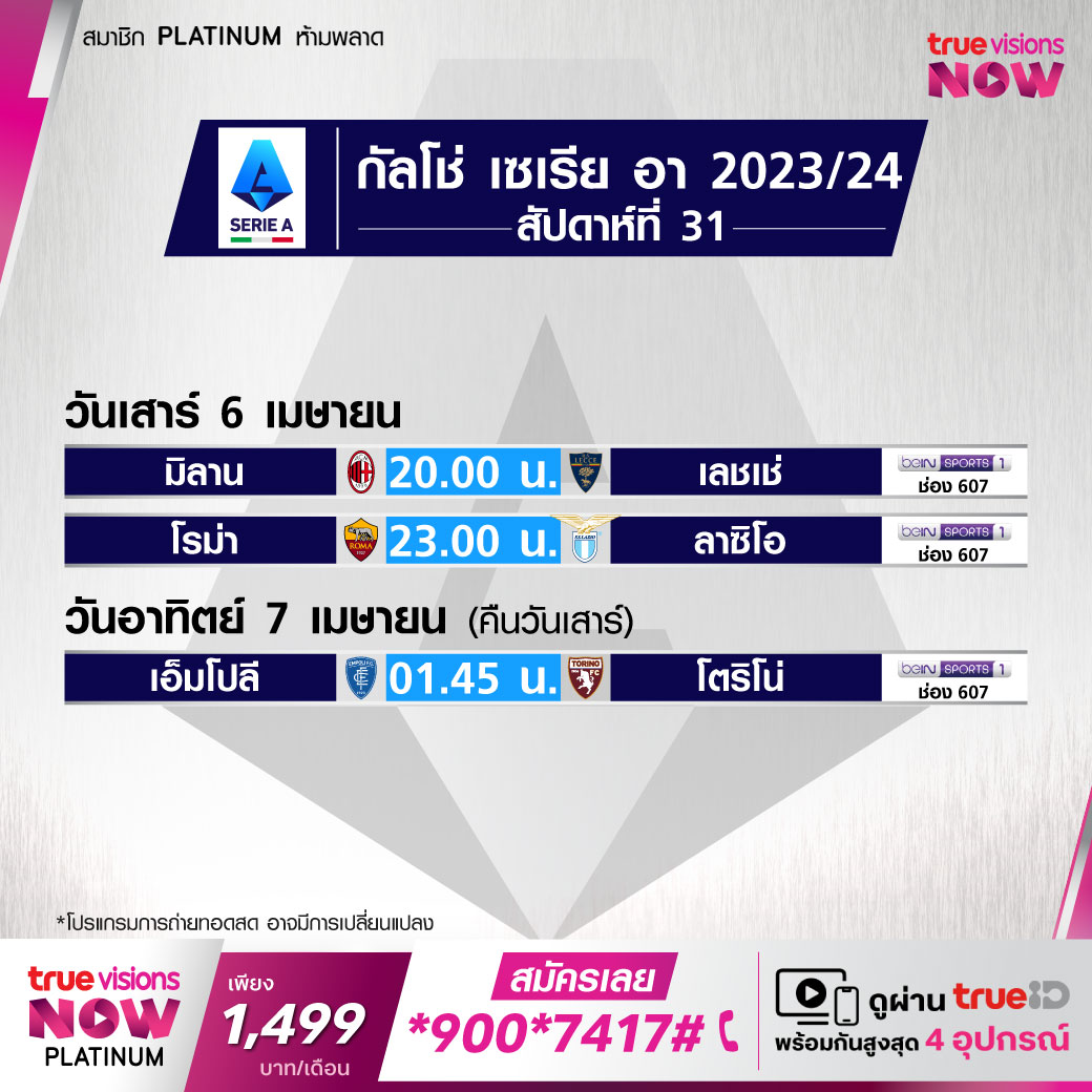 วันนี้มีอะไรดูที่ ทรูวิชั่นส์ ประจำวันเสาร์ที่ 6 เมษายน 67 ยังคงมีกีฬาที่น่าสนใจให้ได้ตามลุ้นตามเชียร์กันเหมือนเดิม โดยในส่วนของฟุตบอลนั้นยังมีศึกพรีเมียร์ลีก อังกฤษ, กัลโช่ เซเรีย อา อิตาลี, บุนเดสลีกา เยอรมนี และ ลีก เอิง ฝรั่งเศส ให้ได้ตามเชียร์กันต่อเนื่อง ส่วนกีฬาอื่นๆ พลาดไม่ได้กับศึกฟอร์มูล่า วัน รายการ เจแปนีส กรังด์ปรีซ์, เทนนิส เอทีพี ทัวร์ รายการ เอสโตริล โอเพ่น, ดับเบิ้ลยูทีเอ ทัวร์ รายการ ชาร์ลสตัน โอเพ่น, กอล์ฟ พีจีเอ ทัวร์ รายการ วาเลโร เท็กซัส โอเพ่น, ลิฟ กอล์ฟ ไมอามี่, กอล์ฟหญิง แอลพีจีเอ ทัวร์ รายการ ที-โมบายล์ แมตช์ เพลย์, ศึกเวิลด์ สนุกเกอร์ รายการ ทัวร์ แชมเปี้ยนชิพ, ยูเอฟซี ไฟต์ ไนท์ และบาสเกตบอลเอ็นบีเอ งานนี้ ทรูวิชั่นส์ จัดเต็มให้ชมกันถึงบ้าน