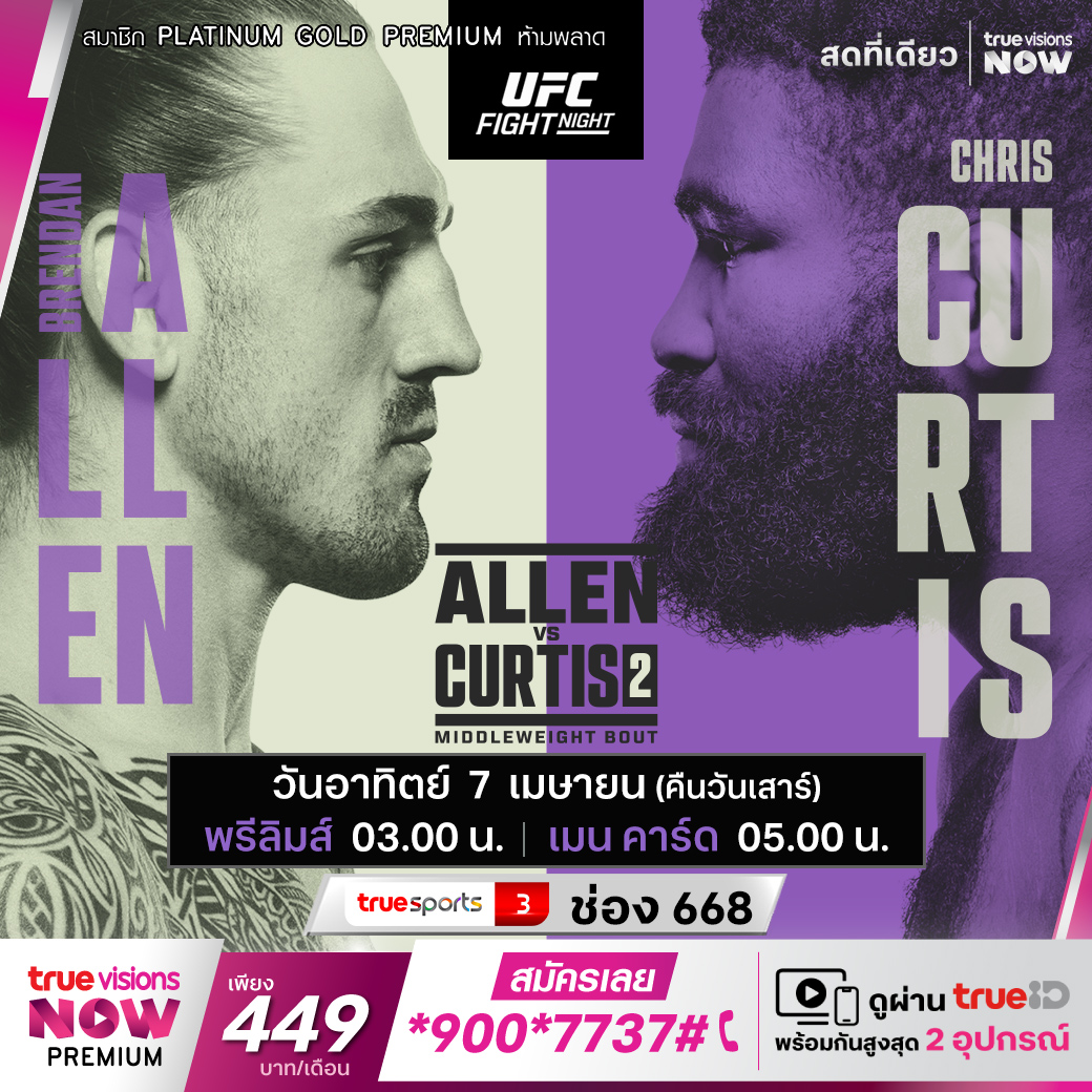 ยูเอฟซี ไฟต์ ไนท์ สัปดาห์นี้ คู่เอกเป็นการรีแมตช์ล้างตากันระหว่าง แบรนดอน อัลเลน รองแชมป์อันดับ 6 รุ่นมิดเดิ้ลเวต ชาวอเมริกัน กับขาโหดของวงการจากชาติเดียวกันอย่าง คริส เคอร์ติส ร่วมด้วยรุ่นฟลายเวต โฮเซ่ จอห์นสัน จากสหรัฐฯ ปะทะ ลูคัส โรช่า จากบราซิล ชมสด ทางทรูวิชั่นส์ ที่เดียว