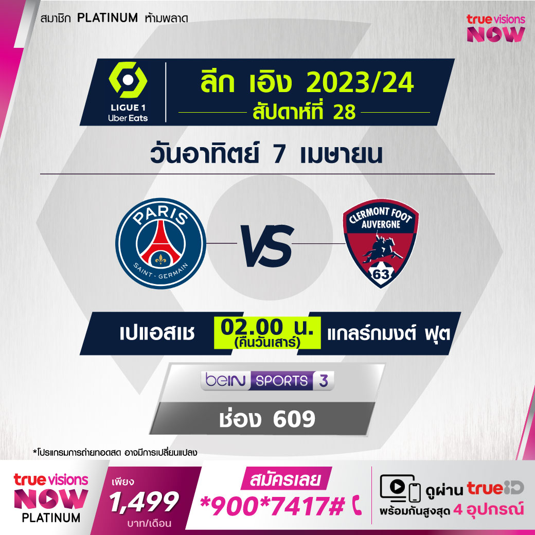 PSG vs Clermont เวลา 02.00-04.00 ทางช่อง beIN 3 (609)