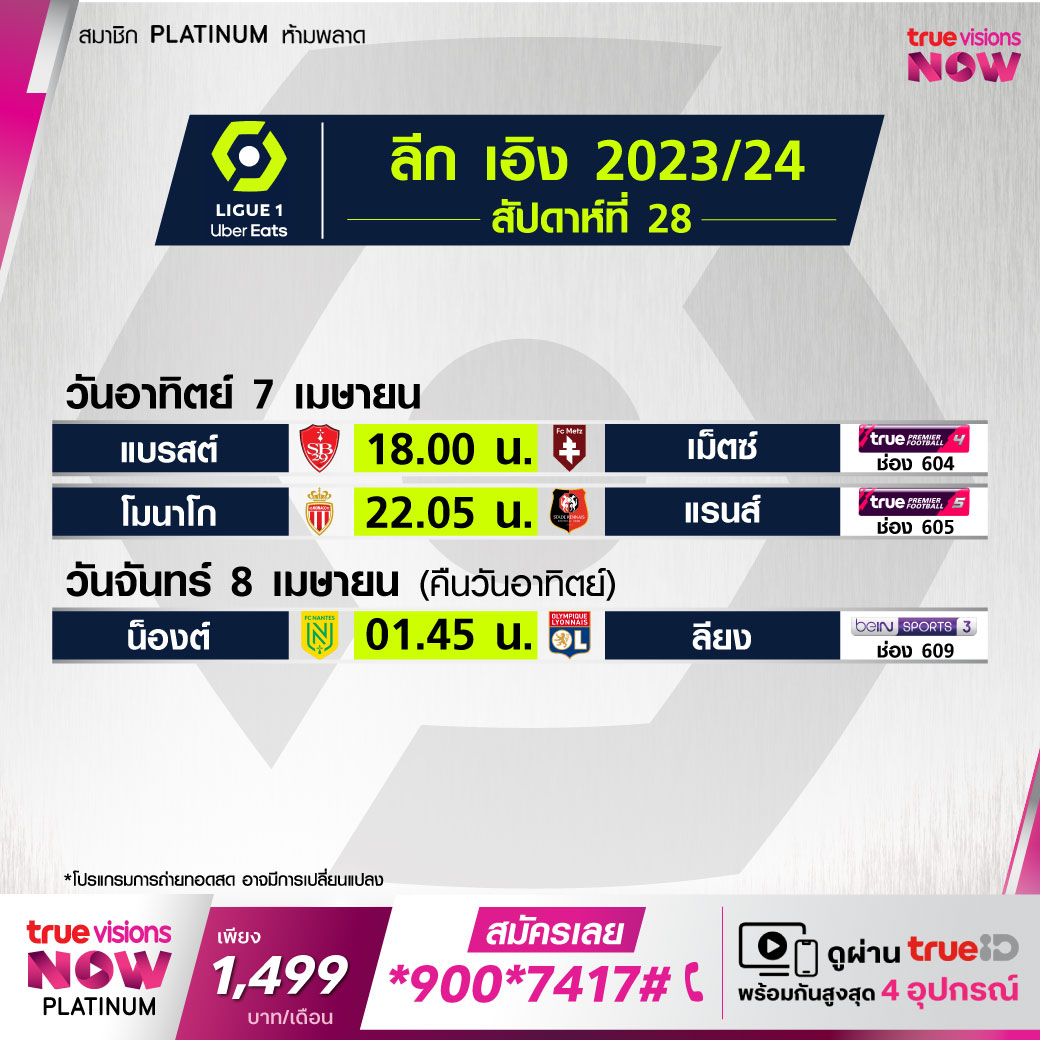 Nantes vs Lyon เวลา 01.45-03.45 ทางช่อง beIN 3 (609)