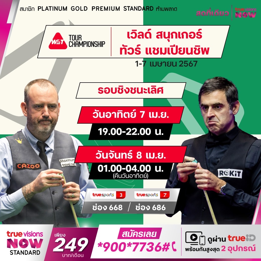 ศึก เวิลด์ สนุกเกอร์ เก็บคะแนนสะสมโลก รายการที่ยิ่งใหญ่อย่าง ทัวร์ แชมเปี้ยนชิพ 2024 เดินทางมาถึงในรอบชิงชนะเลิศแล้ว ใครจะเดินหน้าคว้าแชมป์รายการนี้ไปครอง ชมสด เอ็กซ์คลูซีฟ จากสังเวียน แมนเชสเตอร์ เซนทรัล ในเมืองแมนเชสเตอร์ ประเทศอังกฤษ ครบทุกรอบ ที่เดียวที่ ทรูวิชั่นส์