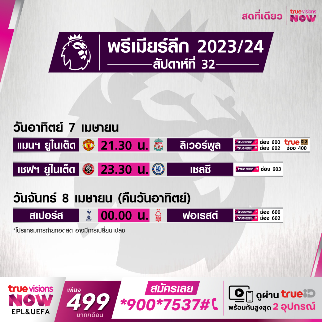 Man Utd vs Liverpool เวลา 21:30 - 23:30 ทางช่อง TPF 1(600) / TPF 2 (602) / 4K (400)