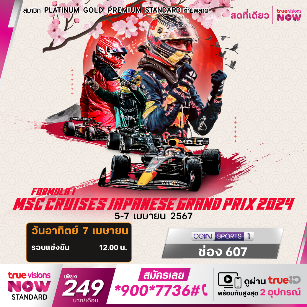 ศึก ฟอร์มูล่า วัน สัปดาห์นี้พบกับรายการ แจแปนีส กรังด์ปรีซ์ จากสังเวียนระดับโลก ซูซูกะ อินเตอร์ชั่นแนล เซอร์กิต ประเทศญี่ปุ่น จับตาดูการ คัมแบ็กของแชมป์โลก 3 สมัย แม็กซ์ เวอร์สแท็ปเพ่น ที่จะกลับมาไล่ล่าตำแหน่งแชมป์อีกครั้ง หลังจากพลาดไปในสนามล่าสุด ชมสด เอ็กซ์คลูซีฟ ทุกรอบการแข่งขัน ที่เดียวที่ ทรูวิชั่นส์