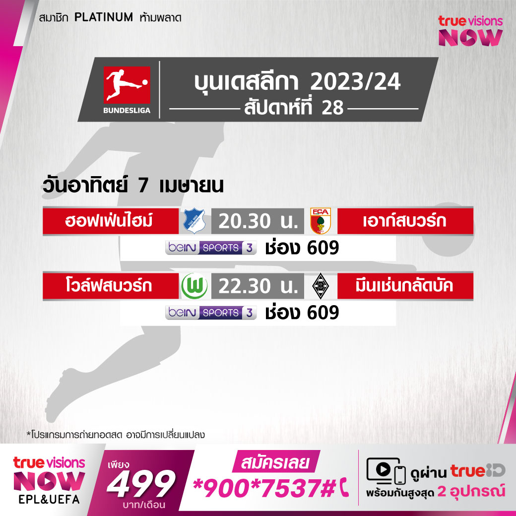 Wolfsburg vs Monchengladbach เวลา 22.30-00.30 ทางช่อง beIN 3 (609)
