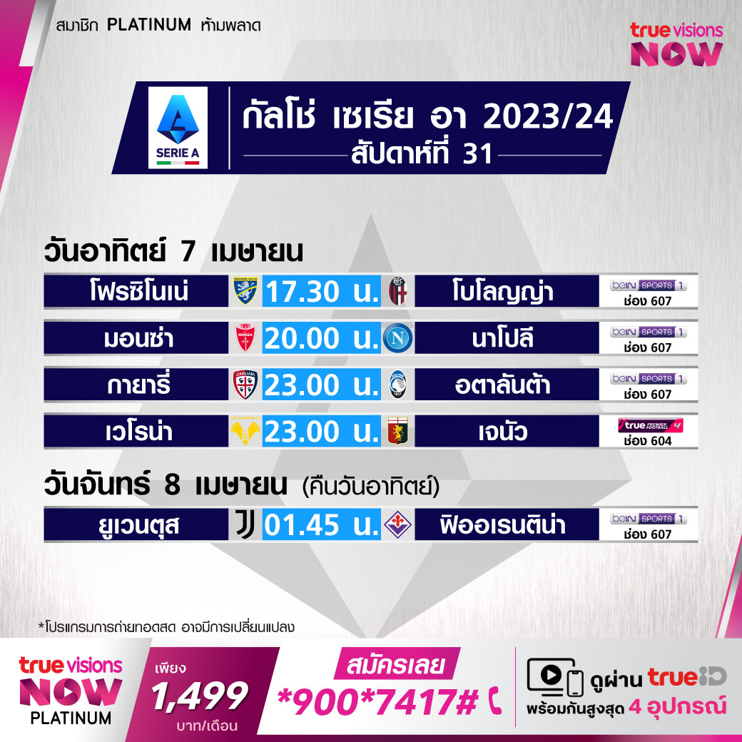 วันนี้มีอะไรดูที่ ทรูวิชั่นส์ ประจำวันอาทิตย์ที่ 7 เมษายน 67 ยังคงมีกีฬาที่น่าสนใจให้ได้ตามลุ้นตามเชียร์กันเหมือนเดิม โดยในส่วนของฟุตบอลนั้นยังมีศึกพรีเมียร์ลีก อังกฤษ, กัลโช่ เซเรีย อา อิตาลี, บุนเดสลีกา เยอรมนี และ ลีก เอิง ฝรั่งเศส ให้ได้ตามเชียร์กันต่อเนื่อง ส่วนกีฬาอื่นๆ พลาดไม่ได้กับศึกฟอร์มูล่า วัน รายการ เจแปนีส กรังด์ปรีซ์, เทนนิส เอทีพี ทัวร์ รายการ เอสโตริล โอเพ่น, ดับเบิ้ลยูทีเอ ทัวร์ รายการ ชาร์ลสตัน โอเพ่น, กอล์ฟ พีจีเอ ทัวร์ รายการ วาเลโร เท็กซัส โอเพ่น, ลิฟ กอล์ฟ ไมอามี่, กอล์ฟหญิง แอลพีจีเอ ทัวร์ รายการ ที-โมบายล์ แมตช์ เพลย์, ศึกเวิลด์ สนุกเกอร์ รายการ ทัวร์ แชมเปี้ยนชิพ, ยูเอฟซี ไฟต์ ไนท์ และบาสเกตบอลเอ็นบีเอ งานนี้ ทรูวิชั่นส์ จัดเต็มให้ชมกันถึงบ้าน