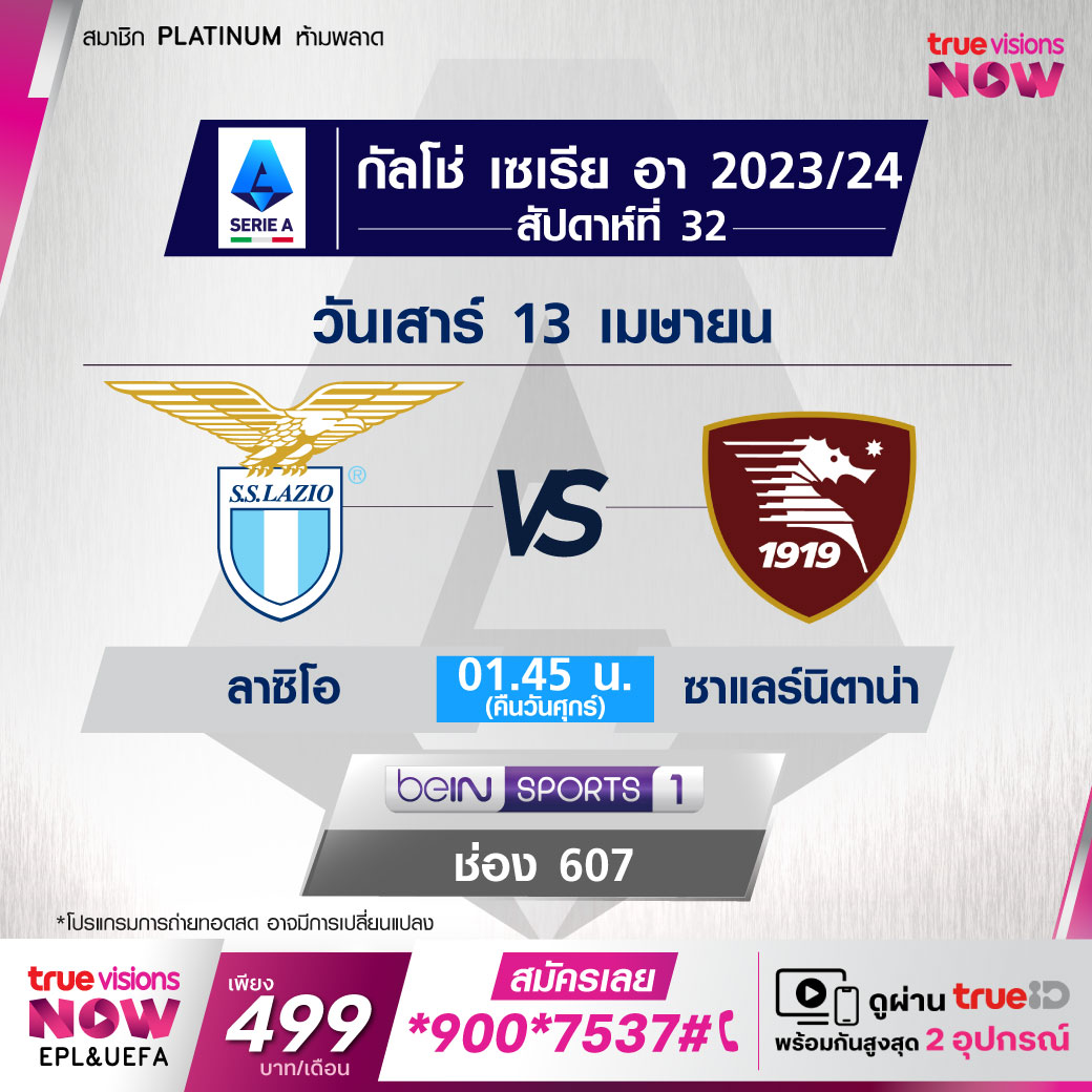 Lazio vs Salernitana เวลา 01.45-03.45 ทางช่อง beIN 1 (607)