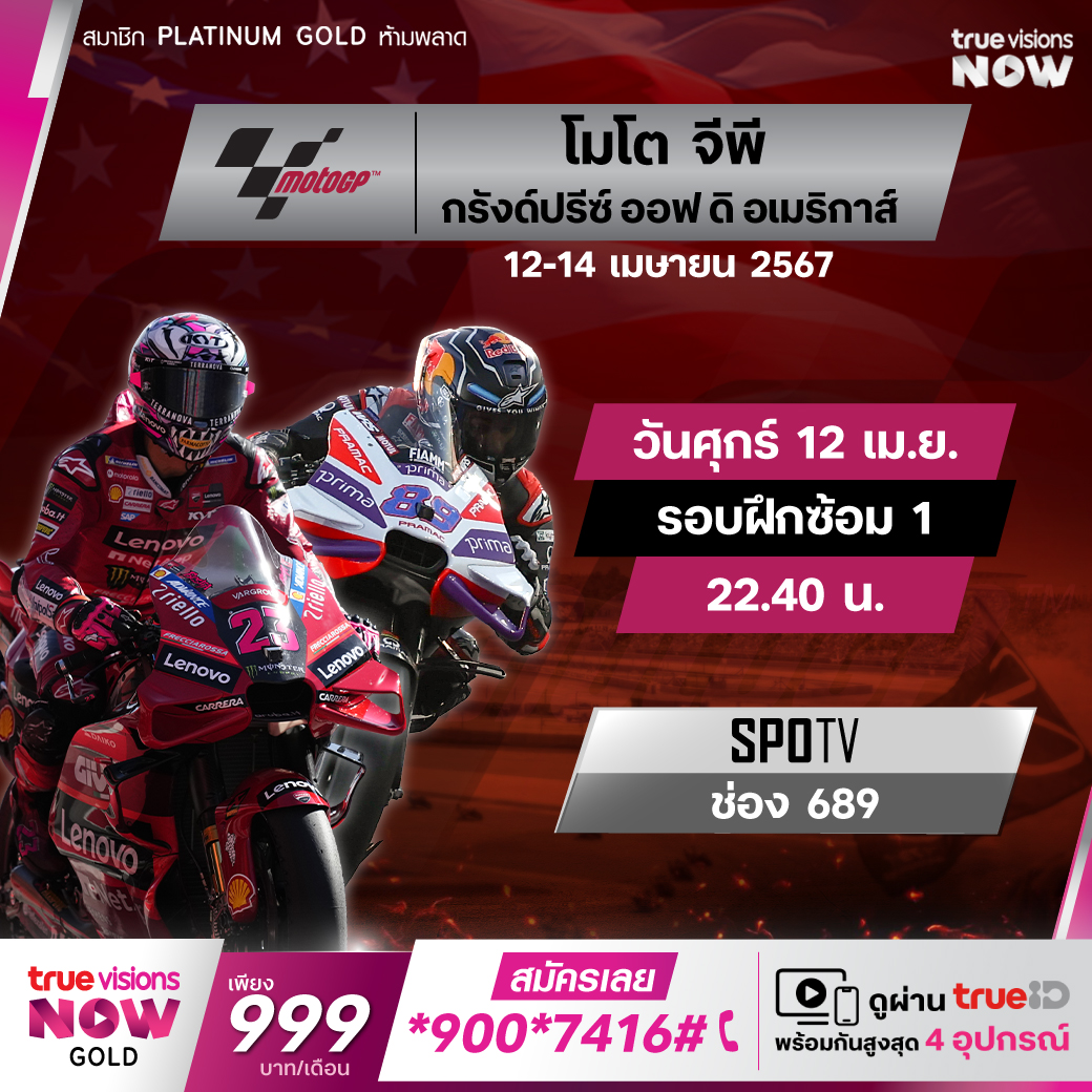 ศึกโมโต จีพี สนามที่ 3 ของฤดูกาล 2024 สุดยอดนักบิดชั้นนำของโลกทั้ง 3 รุ่น บินข้ามทวีป ไปเปิดศึกแย่งชิงอันดับบนโพเดี้ยม และแย่งตำแหน่งแชมป์ที่สหรัฐอเมริกา กับรายการ กรังด์ปรีซ์ ออฟ ดิ อเมริกาส์ ที่สังเวียน เดอะ เซอร์กิต ออฟ ดิ อเมริกาส์ ออสติน รัฐเท็กซัส สด ครบทั้ง โมโต 3, โมโต 2 และมันส์สุดๆ กับพรีเมียร์คลาสอย่าง โมโต จีพี ที่ ทรูวิชั่นส์