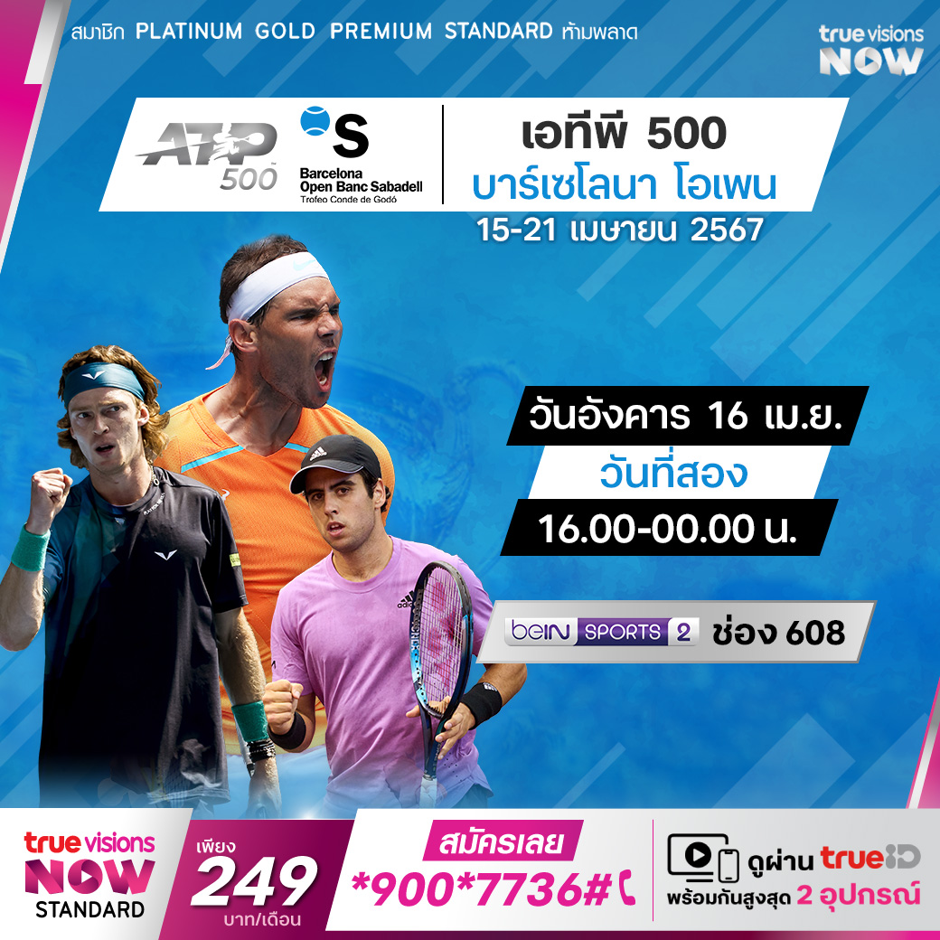 เทนนิส เอทีพี ทัวร์ สัปดาห์นี้ ไปกันที่รายการใหญ่จากเมืองบาร์เซโลน่า ประเทศสเปน กับรายการ บาร์เซโลน่า โอเพ่น นำโดยผู้เล่นเจ้าถิ่นชื่อดังอย่าง คาร์ลอส อัลคาราซ ร่วมด้วย อังเดร รูเบรฟ และ แคสเปอร์ รูด ร่วมลุ้นกันว่าใครจะคว้าแชมป์ไปครอง ชมสด ที่ ทรูวิชั่นส์