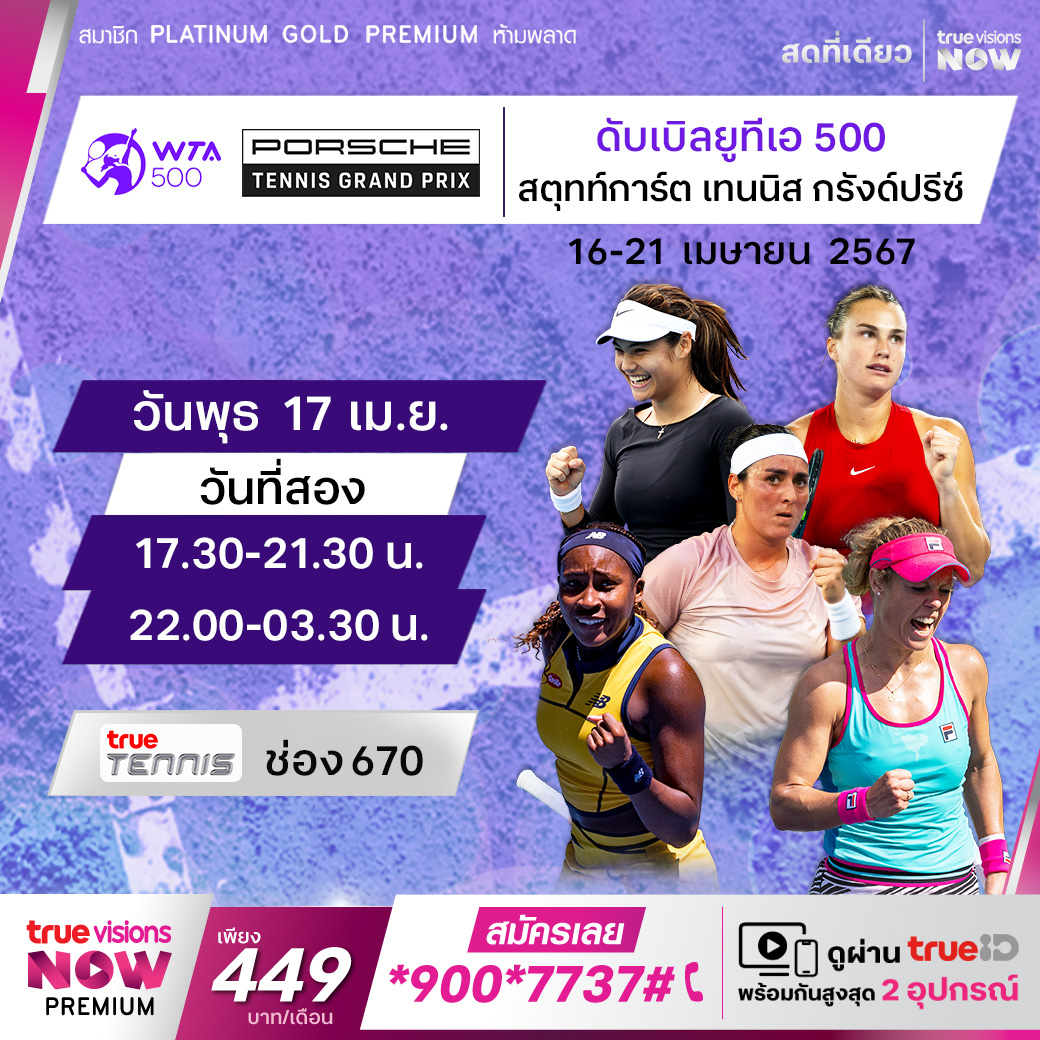 เทนนิสหญิง ดับเบิ้ลยูทีเอ ทัวร์ สัปดาห์นี้ไปกันที่การแข่งขันคอร์ทดินในร่ม ในรายการ สตุ๊ตการ์ท เทนนิส กรังด์ปรีซ์ รวมดารานักเทนนิสเข้าร่วมแบบจัดเต็ม อาทิ อิกา ซิออนเทค, อารีนา ซาบาเลนก้า, โคโค กอฟ์ฟ และ เอลินา ริบาคินา ร่วมลุ้นกันว่าใครจะคว้าแชมป์ปีนี้ไปครอง ชมสด ที่ ทรูวิชั่นส์