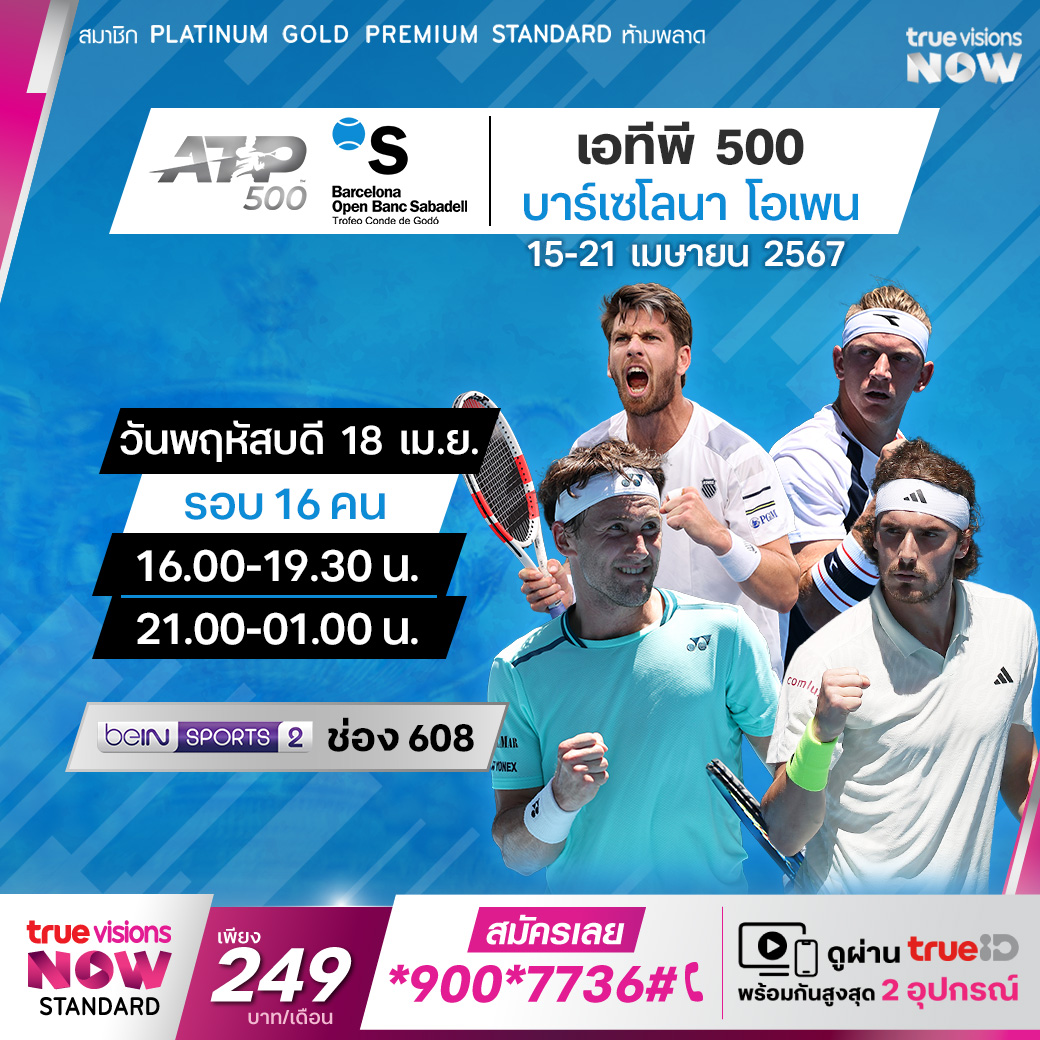 เทนนิส เอทีพี ทัวร์ สัปดาห์นี้ ไปกันที่รายการใหญ่จากเมืองบาร์เซโลน่า ประเทศสเปน กับรายการ บาร์เซโลน่า โอเพ่น นำโดยผู้เล่นเจ้าถิ่นชื่อดังอย่าง คาร์ลอส อัลคาราซ ร่วมด้วย อังเดร รูเบรฟ และ แคสเปอร์ รูด ร่วมลุ้นกันว่าใครจะคว้าแชมป์ไปครอง ชมสด ที่ ทรูวิชั่นส์