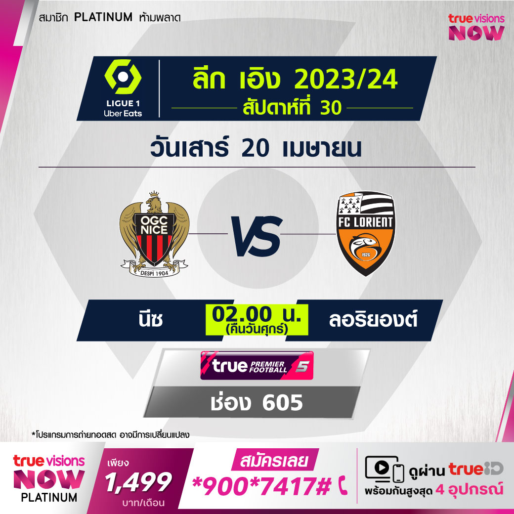 Nice vs Lorient เวลา 02.00-04.00 ทางช่อง TPF 5 (605)