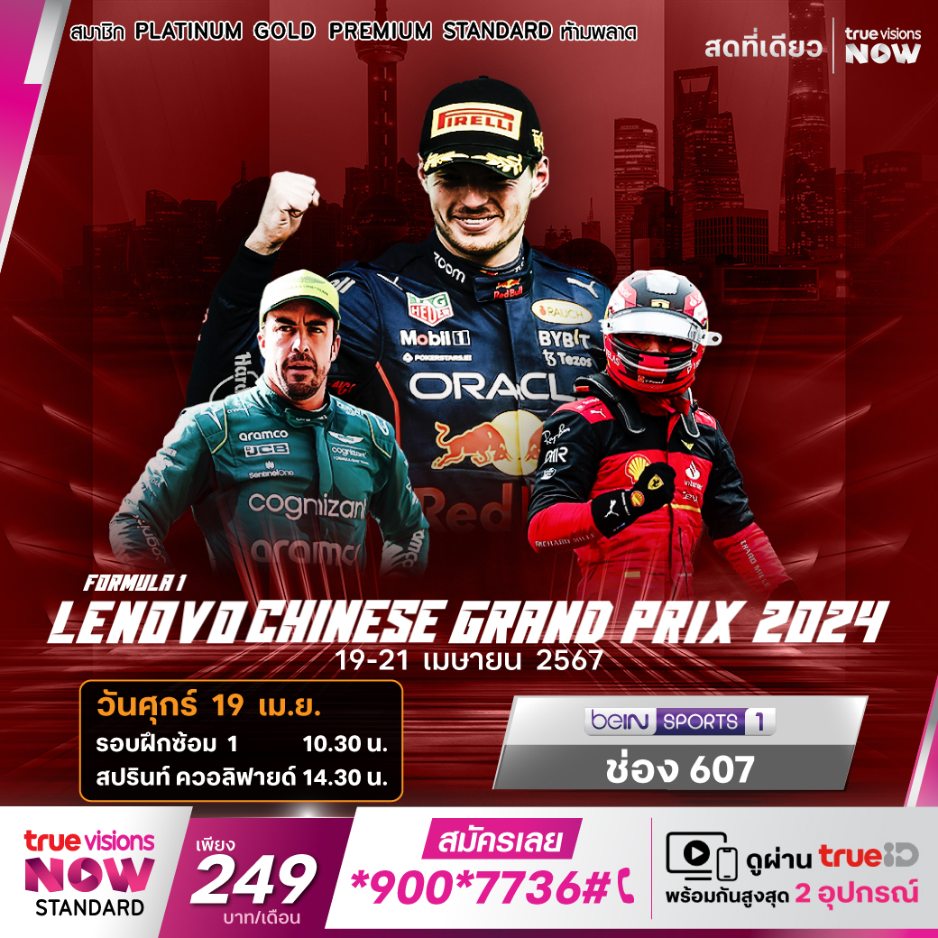 ศึกฟอร์มูล่าวัน รายการ ไชนีส กรังด์ปรีซ์ จากสนาม เซี่ยงไฮ้ อินเตอร์เนชั่นแนล เซอร์กิต ประเทศจีน ติดตามกันว่าใครจะมาหยุดยั้งฟอร์มโหดของ แม็กซ์ เวอร์สแท็ปเพ่น และทีมเร้ดบูลส์ ได้ ชมสด เอ็กซ์คลูซีฟ ทุกช่วงการแข่งขัน ที่เดียว ที่ ทรูวิชั่นส์