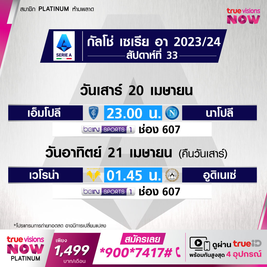Empoli vs Napoli เวลา 23.00-01.00 ทางช่อง beIN 1 (607)