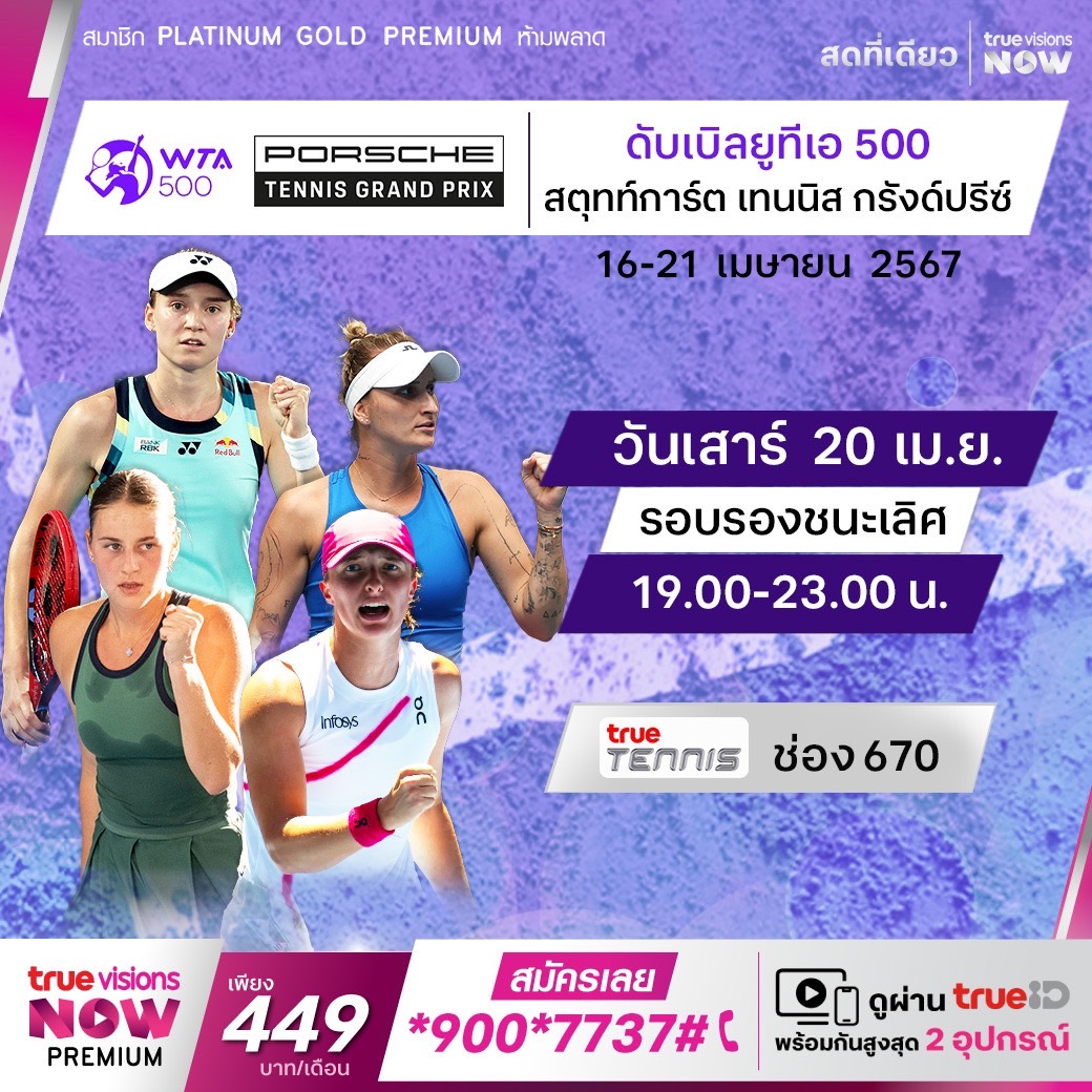 เทนนิสหญิง ดับเบิ้ลยูทีเอ ทัวร์ รายการ สตุ๊ตการ์ท เทนนิส กรังด์ปรีซ์ ที่เมืองสตุ๊ตการ์ท ประเทศเยอรมนี มาถึงในรอบรองชนะเลิศแล้ว ร่วมลุ้นกันว่าใครจะคว้าแชมป์ปีนี้ไปครอง ชมสด ที่ ทรูวิชั่นส์
