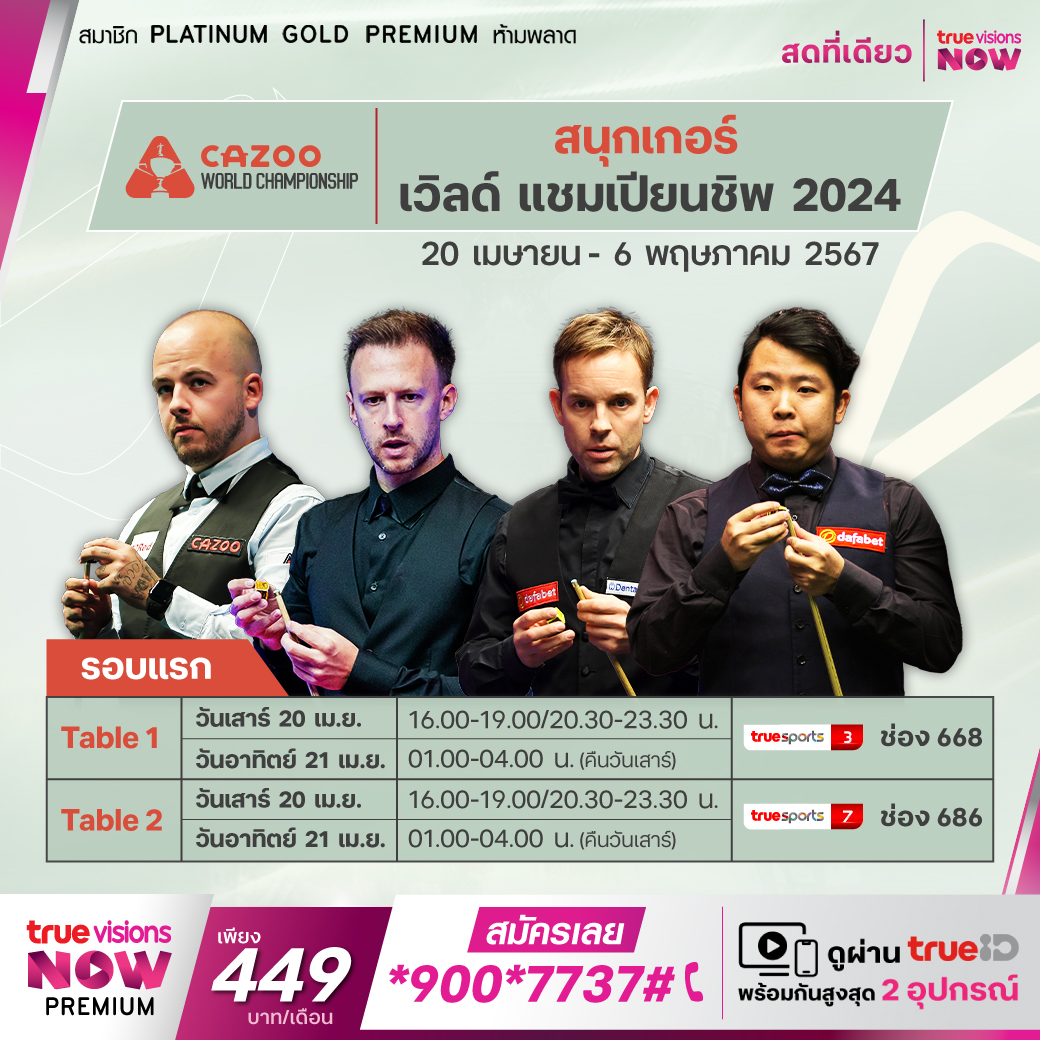 ศึกที่แฟนสนุกเกอร์ทั่วโลกรอคอยมาถึงแล้ว กับศึกชิงแชมป์โลก เวิลด์ แชมเปี้ยนชิพ 2024 การดวลความแม่นของบรรดานักสนุกเกอร์ที่เก่งที่สุดในยุคนี้ ณ ครูซิเบิ้ล เธียเตอร์ เมืองเชฟฟิลด์ ประเทศอังกฤษ รายการส่งท้ายของฤดูกาล ที่เหล่านักสนุกเกอร์ฝีมือระดับโลกจะมาวัดฝีมือกันว่าใครจะคว้าแชมป์อันทรงเกียรตินี้ไปครองได้ ชมสด เอ็กซ์คลูซีฟ ที่เดียวที่ ทรูวิชั่นส์