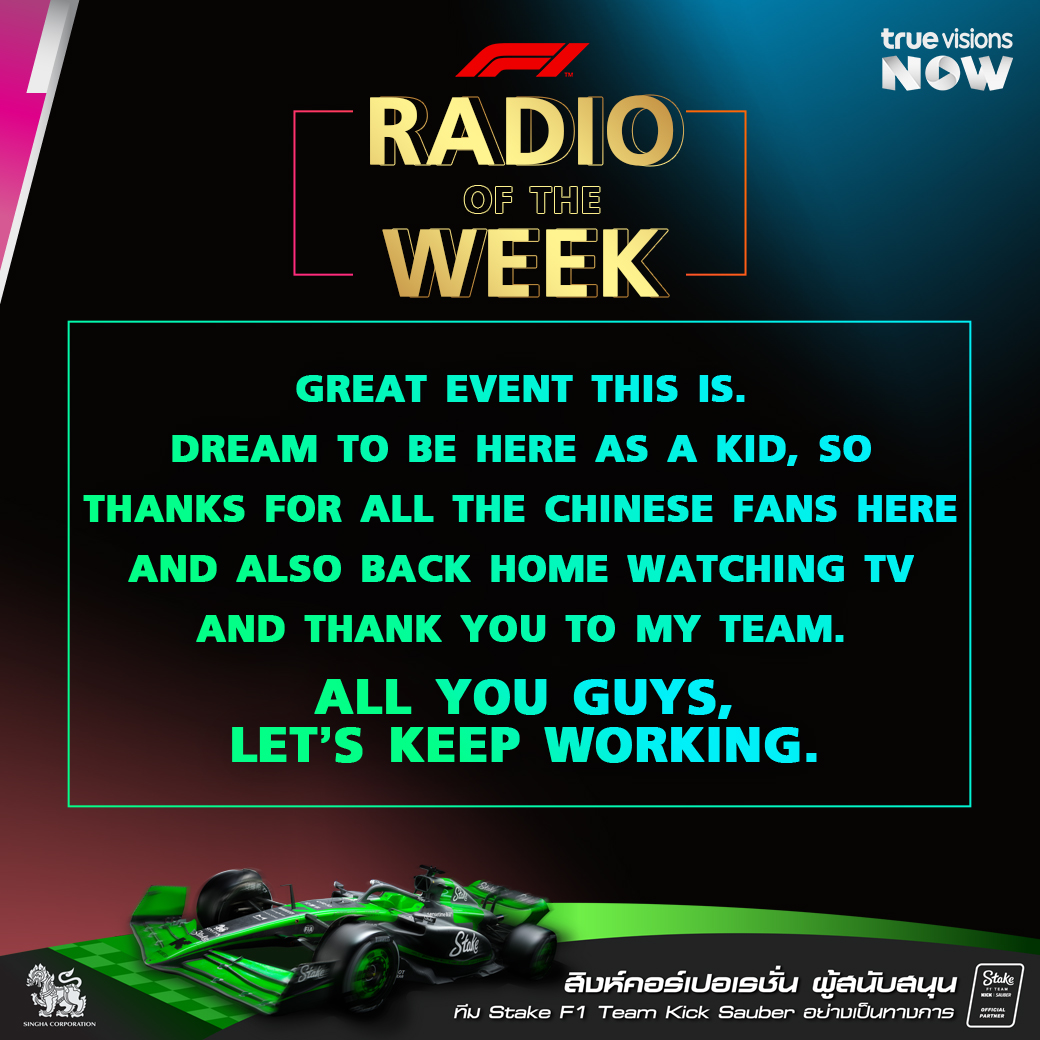 เด็กน้อยและฝันอันยิ่งใหญ่ นี่คือใจความของนักขับชาวจีนคนแรก ที่แม้ไม่ได้คะแนนแรกในซีซั่นนี้ที่บ้านเกิด แต่ยังได้ใจกองเชียร์มหาประชาชนจีน และสิ้นสุดการรอคอยอันยาวนาน จากวันที่มาดู ฟอร์มูล่า วัน บนแกรนด์แสตนด์ 20 ปีที่แล้ว เมื่อ ไชนีส กรังด์ปรีซ์ จัดขึ้นเป็นครั้งแรก