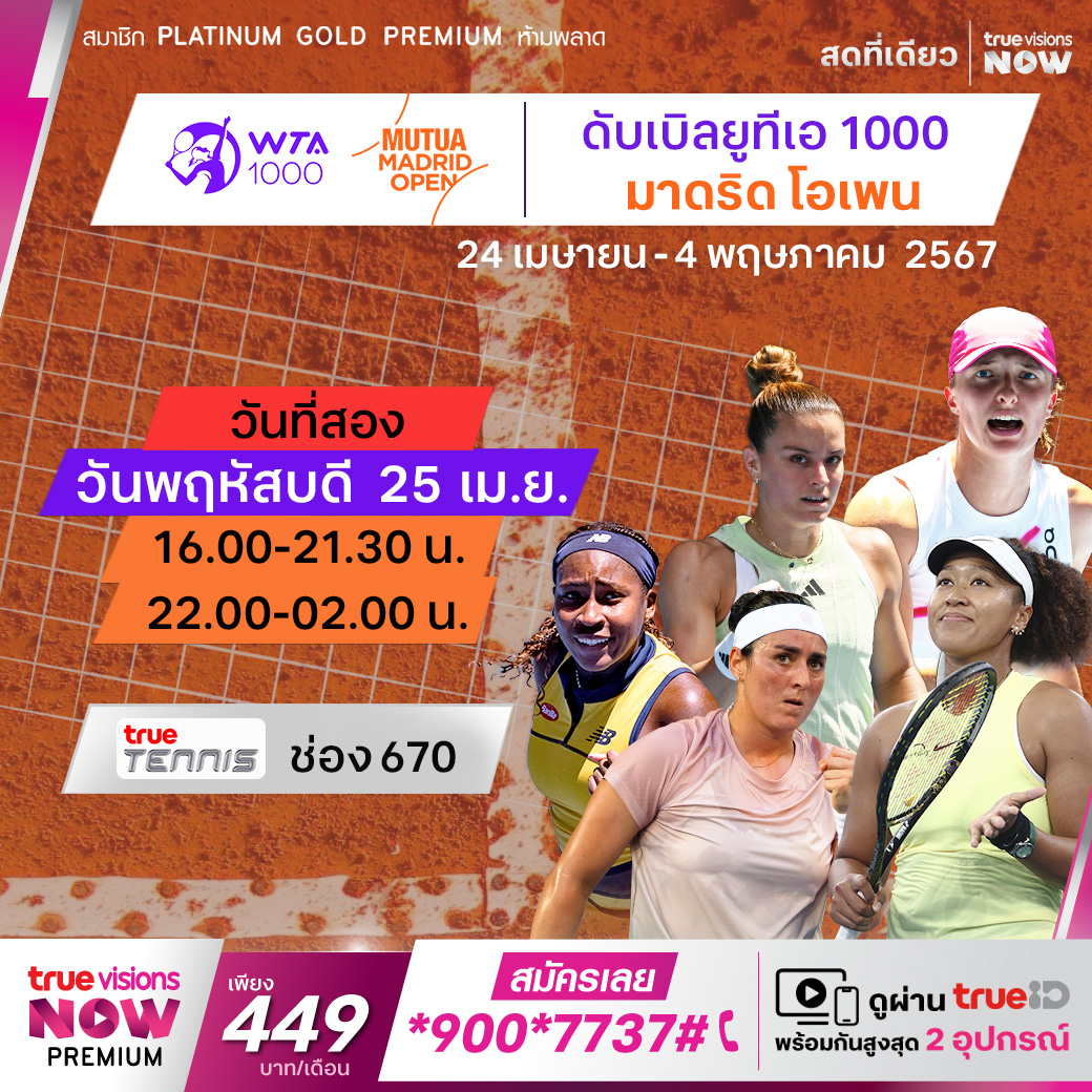 ติดตามชมเทนนิสหญิงรายการใหญ่ รายการระดับ WTA 1000 จากกรุงมาดริด ประเทศสเปน ในรายการ มาดริด โอเพ่น ร่วมด้วย