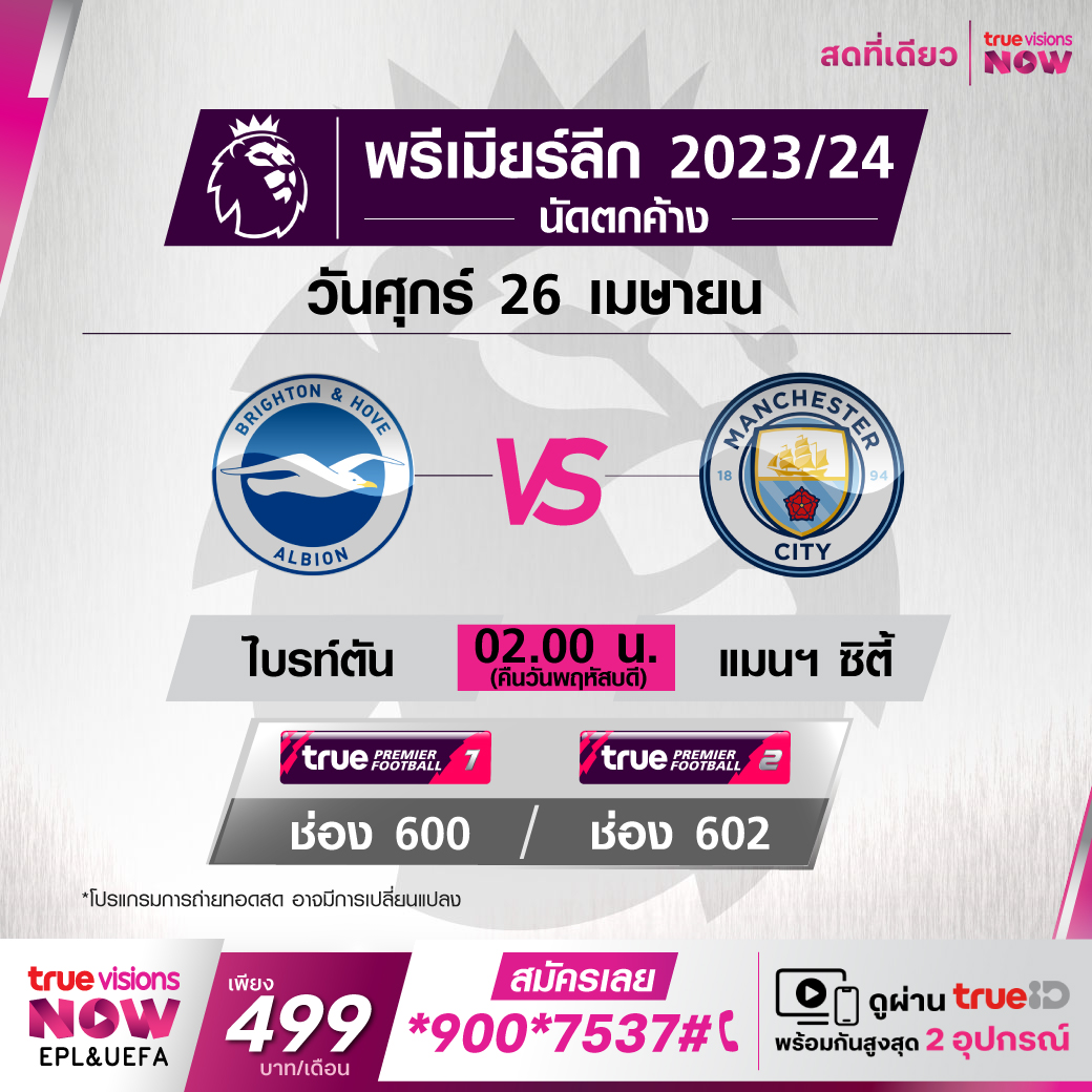 Brighton vs Man City เวลา 02:00 - 04:00 ทางช่อง TPF 1(600) / TPF 2 (602)
