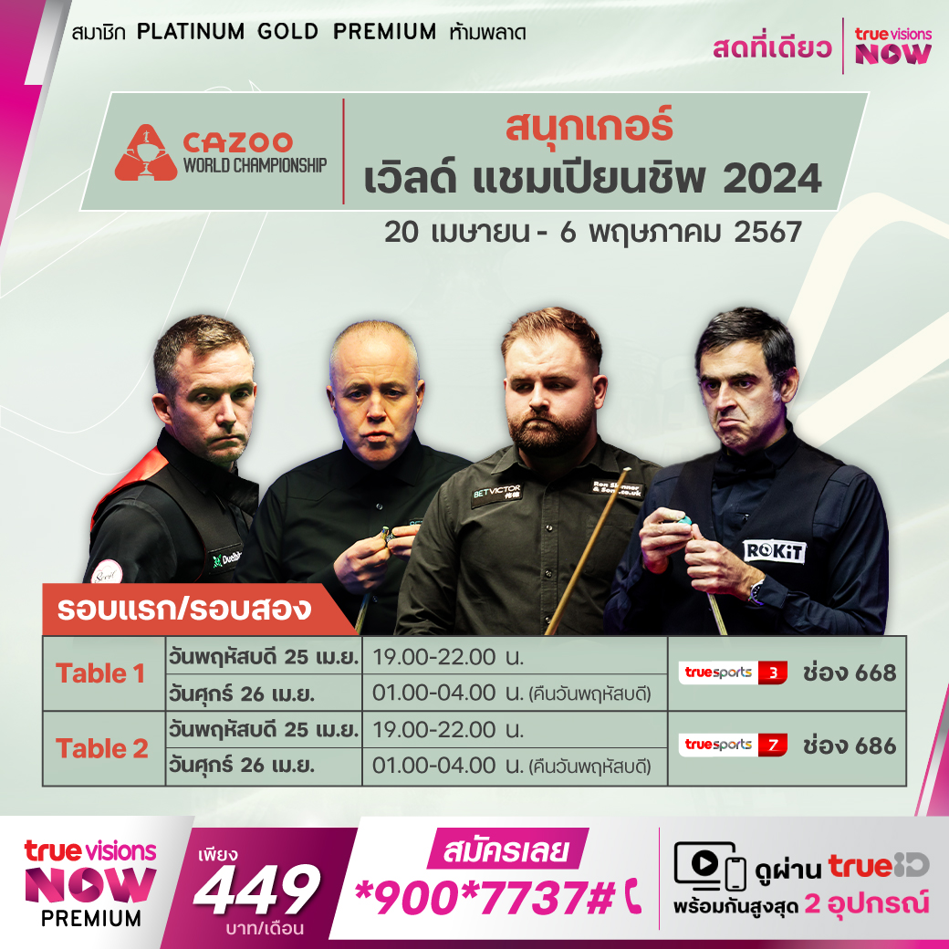 ศึกที่แฟนสนุกเกอร์ทั่วโลกรอคอยมาถึงแล้ว กับศึกชิงแชมป์โลก เวิลด์ แชมเปี้ยนชิพ 2024 การดวลความแม่นของบรรดานักสนุกเกอร์ที่เก่งที่สุดในยุคนี้ ณ ครูซิเบิ้ล เธียเตอร์ เมืองเชฟฟิลด์ ประเทศอังกฤษ รายการส่งท้ายของฤดูกาล ที่เหล่านักสนุกเกอร์ฝีมือระดับโลกจะมาวัดฝีมือกันว่าใครจะคว้าแชมป์อันทรงเกียรตินี้ไปครองได้ ชมสด เอ็กซ์คลูซีฟ ที่เดียวที่ ทรูวิชั่นส์