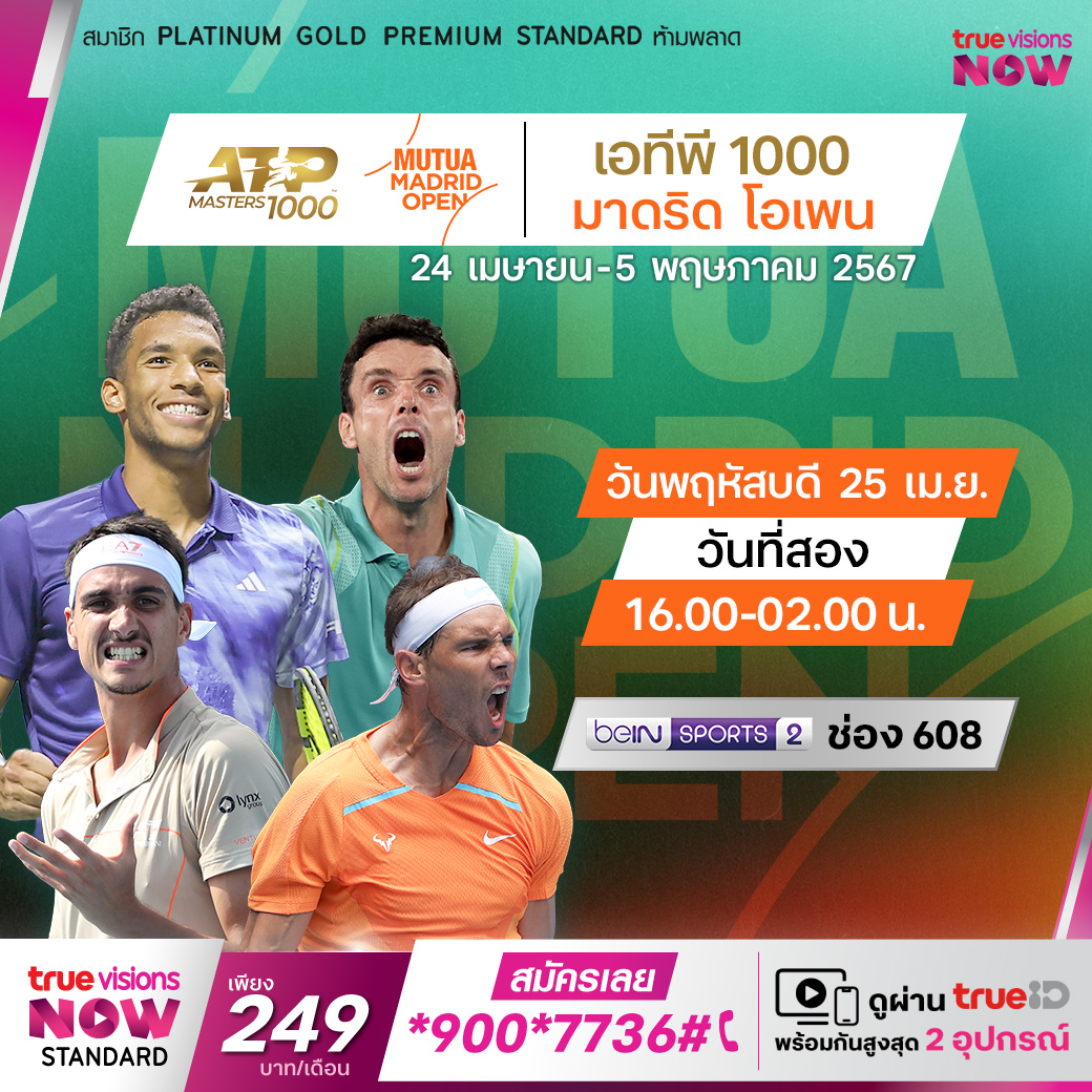 ติดตามชมเทนนิสชายรายการใหญ่ ระดับ ATP 1000 จากกรุงมาดริด ประเทศสเปน ในรายการ มาดริด โอเพ่น ร่วมด้วยนักเทนนิสชื่อดังอย่าง ยานนิค ซินเนอร์ และ คาร์ลอส อัลคาราซ ร่วมลุ้นกันว่านักเทนนิสคนใดจะคว้าแชมป์ไปครอง ชมสดที่ ทรูวิชั่นส์