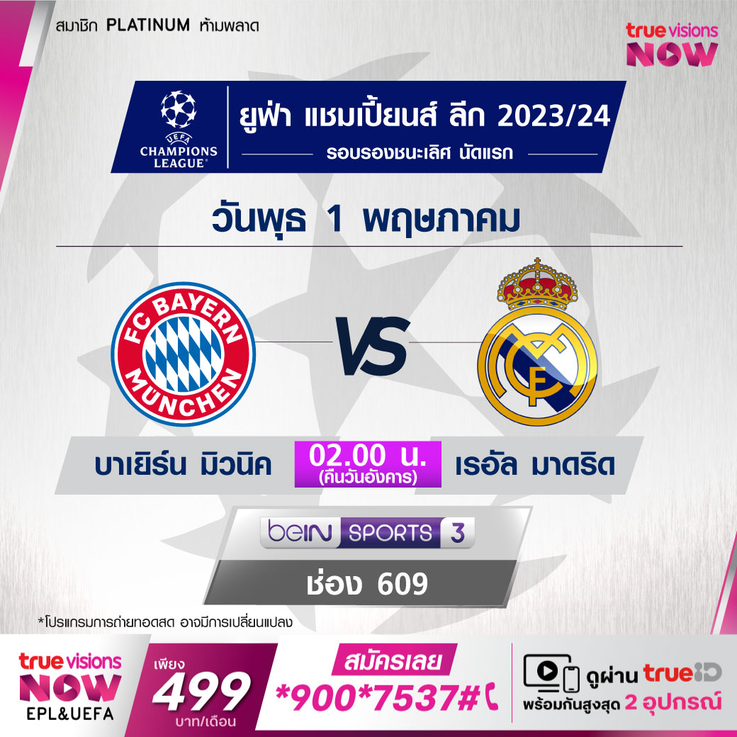 Bayern vs Real Madrid เวลา 02.00-04.00 ทางช่อง beIN 3 (609)