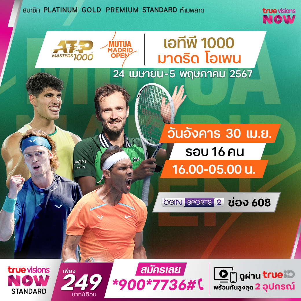 ติดตามชมเทนนิสชายรายการใหญ่ ระดับ ATP 1000 จากกรุงมาดริด ประเทศสเปน ในรายการ มาดริด โอเพ่น เดินทางมาถึงในรอบ 16 คนสุดท้ายแล้ว ร่วมลุ้นกันว่านักเทนนิสคนใดจะคว้าแชมป์ไปครอง ชมสดที่ ทรูวิชั่นส์