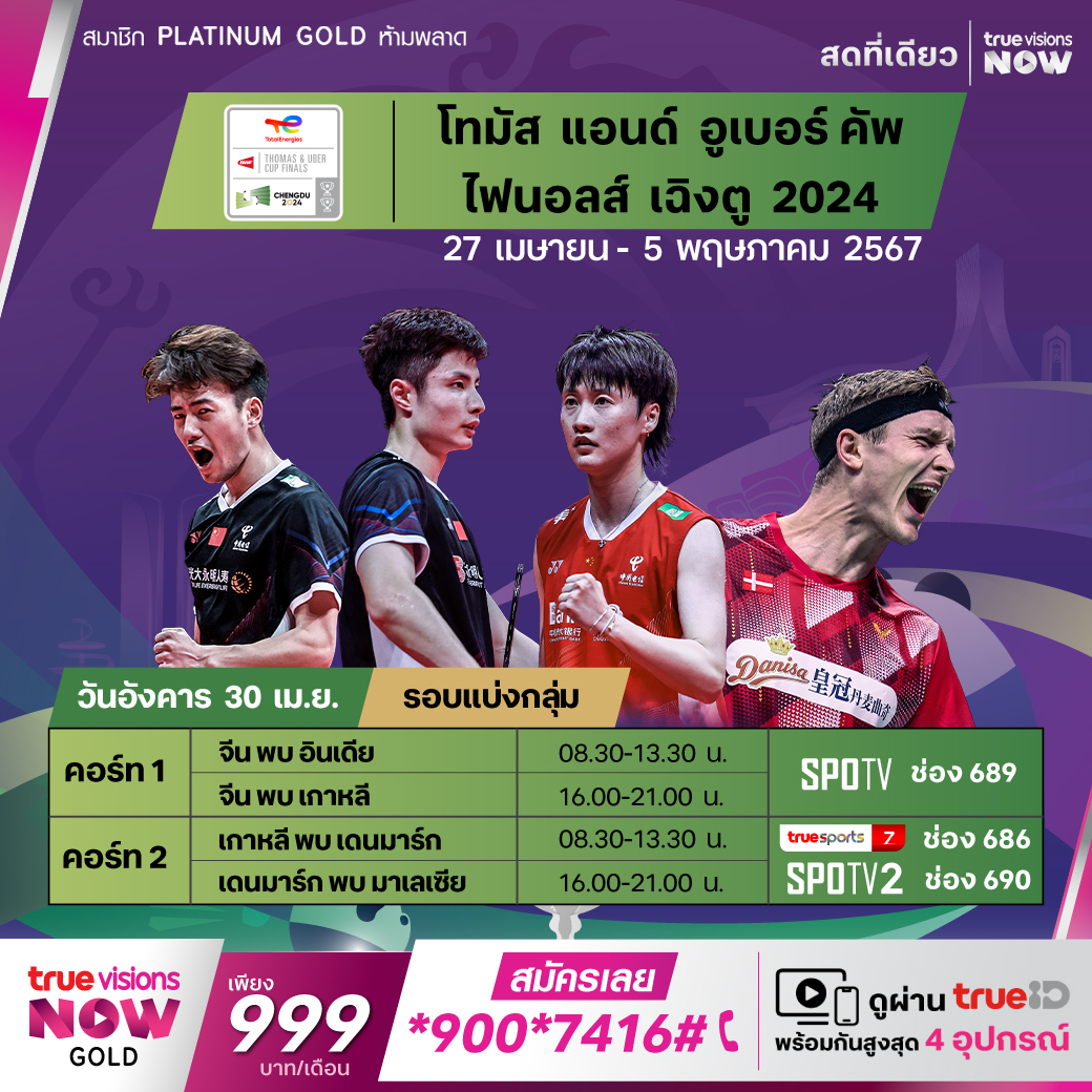 แบดมินตัน บีดับเบิ้ลยูเอฟ รายการ โทมัส คัพ แอนด์ อูเบอร์ คัพ 2024 ไฟนอลส์ ที่เฉิงตู ประเทศจีน ร่วมเชียร์ทีมแบดมินตันชายและทีมหญิงไทย สู้กับนักแบดฝีมือระดับโลก ที่มีแชมป์โลกเป็นเดิมพัน สดจุใจ เอ็กซ์คลูซีฟ ตั้งแต่รอบแบ่งกลุ่ม ถึงรอบน็อกเอาท์และรอบชิงชนะเลิศ ที่เดียว ที่ ทรูวิชั่นส์